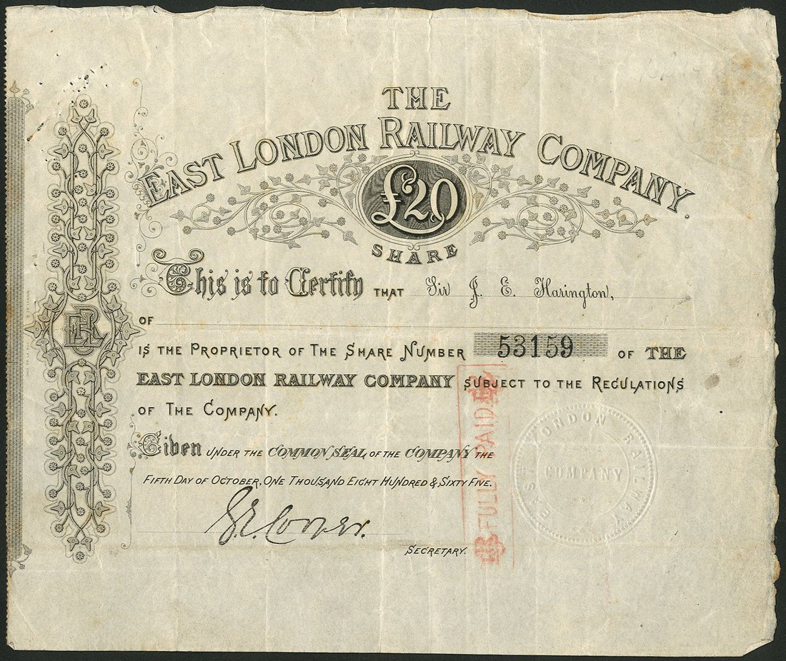 East London Railway Company, £20 share, 1865, no.53159, attractive black printing, red overprint fully paid, very fine and scarce.