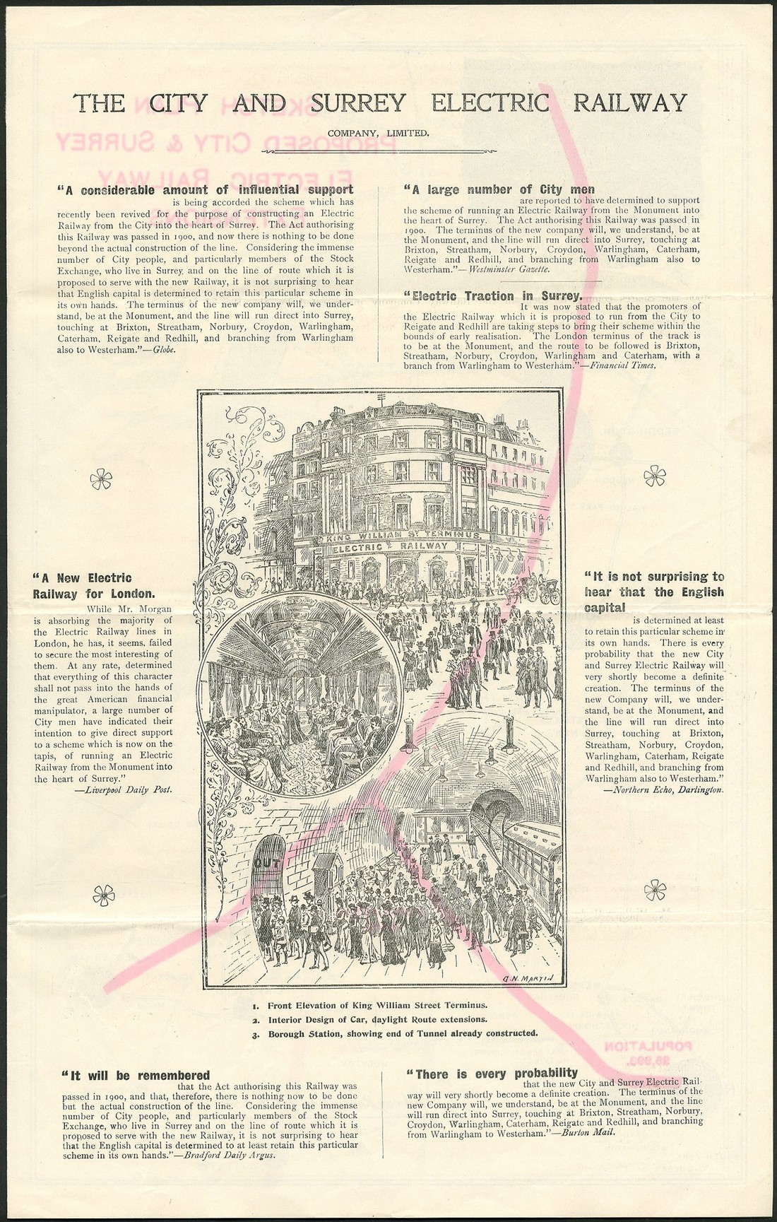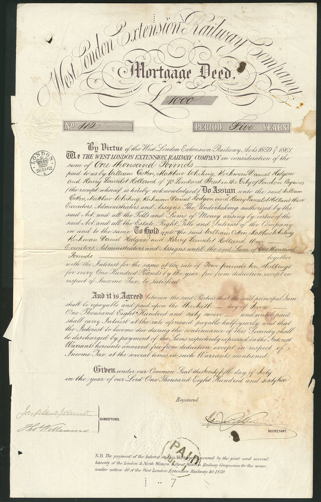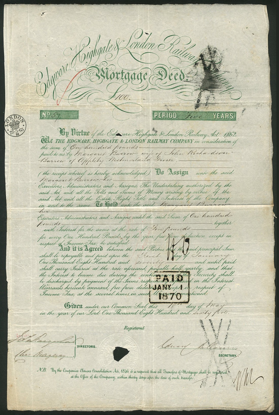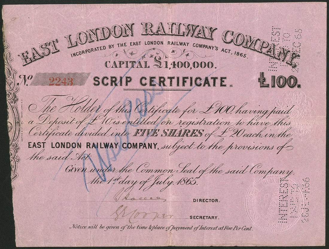 East London Railway Co., scrip certificate for 5 shares of £20 each, 1865, no.2243, black on pink paper, together with Edgware, Highgate & London Railway Co., mortgage deed for £100, 18[65], no.57, green; West London Extension Railway Co., mortgage deed for £1000, 18[62], no.112, mauve; and a prospectus for the City and Surrey Railway, four pages, the mortgage bonds with stains, fine to very fine. (4)