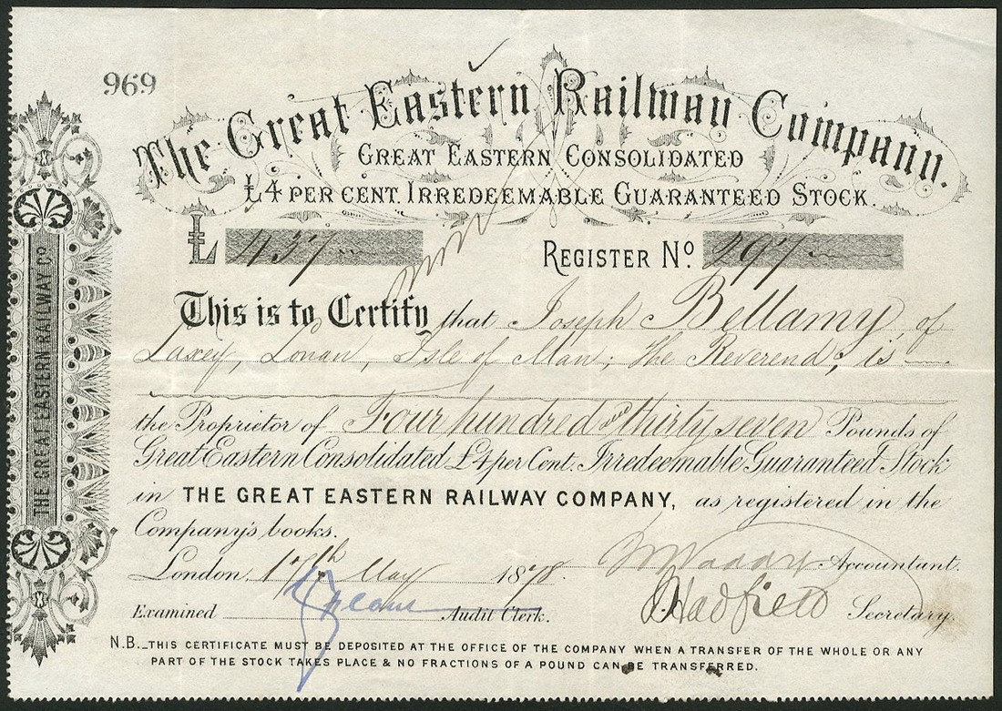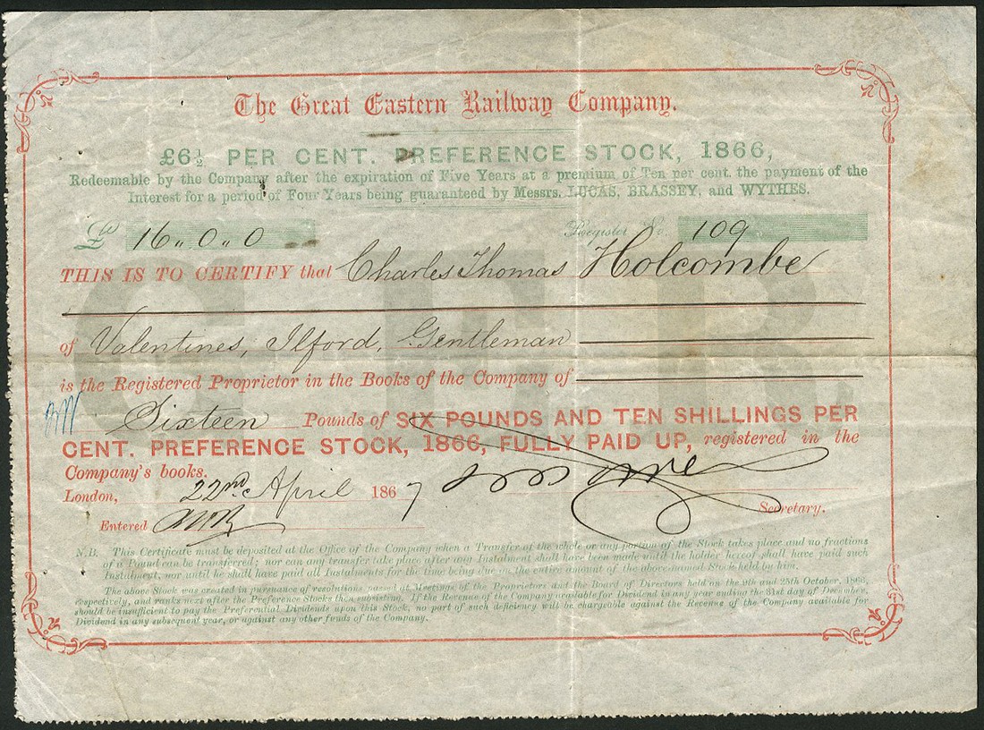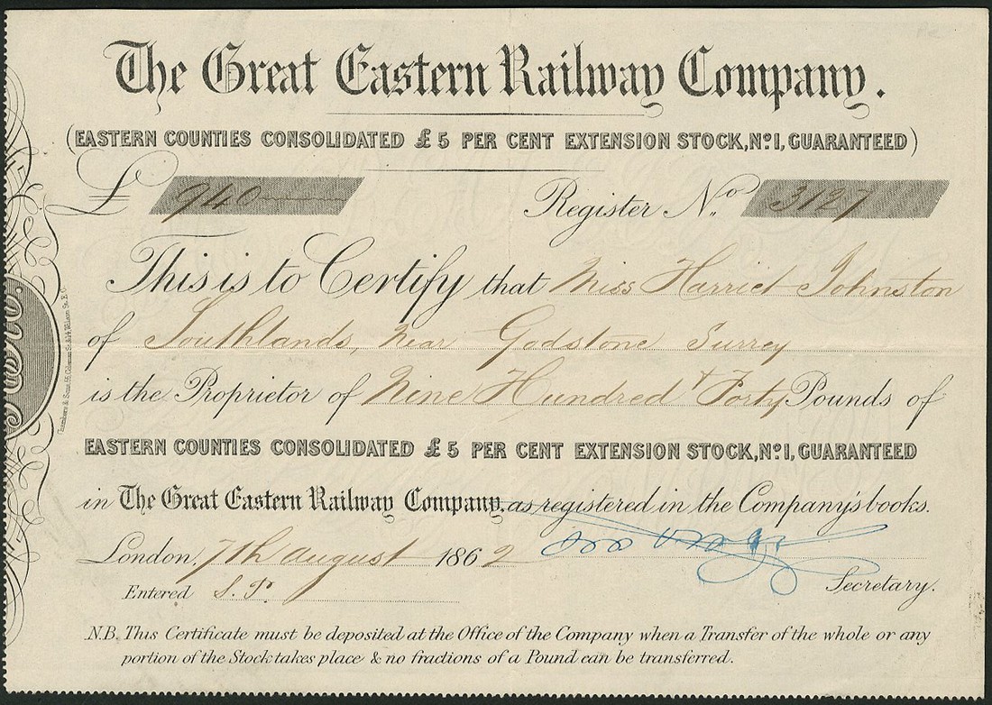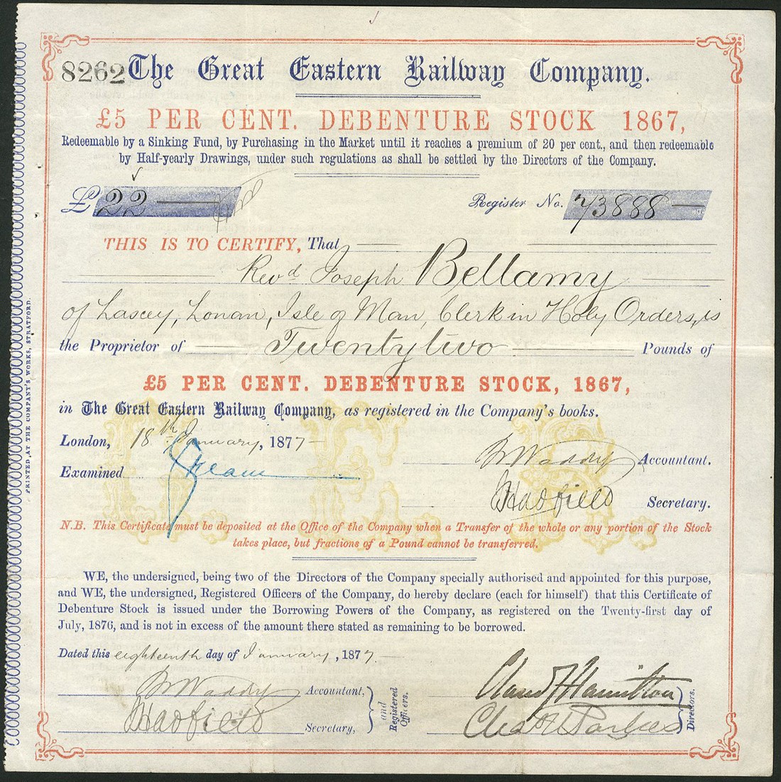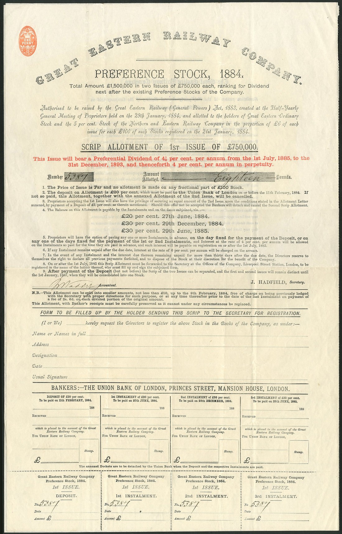 Great Eastern Railway Company, an interesting collection of five pieces comprising; consolidated 4% irredeemable guaranteed stock, 18[78], no.297, decorative title and scrollwork, black; consolidated 5% extension stock no.1 guaranteed, 186[2], no.3127, black; 5% debenture stock 1867, 187[7], no.73888, fine border, red and blue; 6½ % preference stock 1866, 186[7], no.109, green and red; preference stock 1884, scrip allotment of 1st and 2nd issues, large format, black and blue, fine to good very fine. (5)