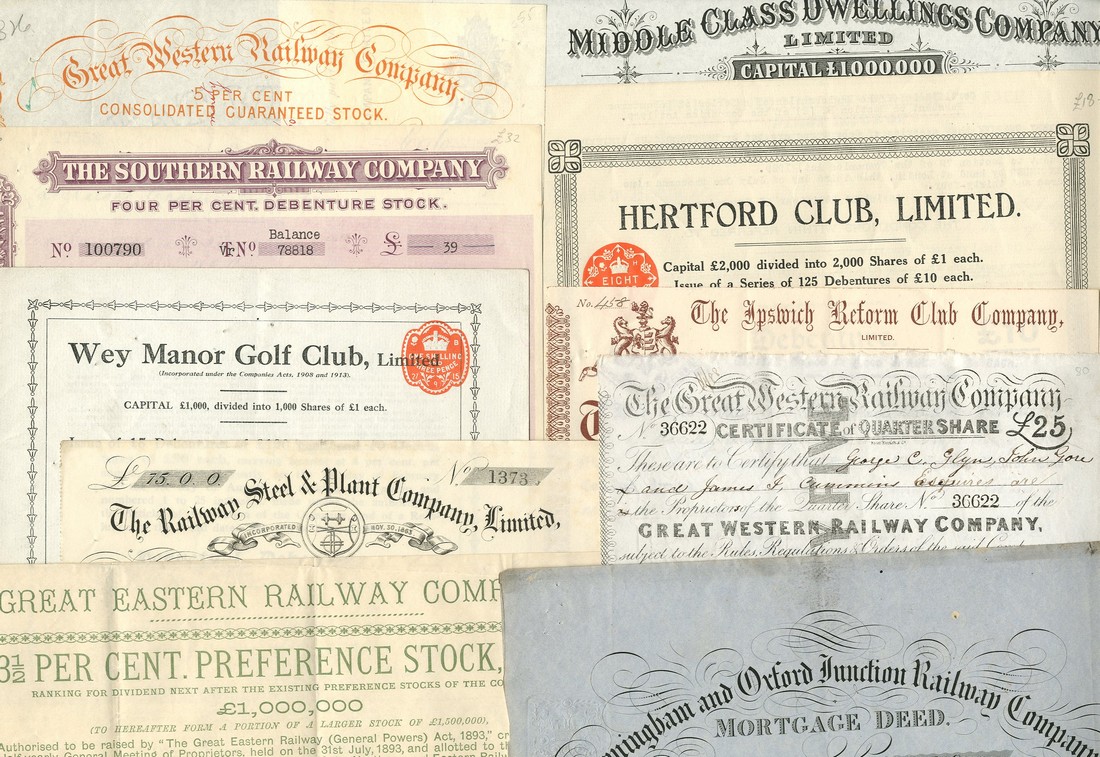 Great Western Railway Company, certificate of quarter share of £25, 184[5], no.36622, black, red paper seal, together with Birmingham and Oxford Junction Railway Co., mortgage deed for £2500, 18[49], no.15, black on blue paper; Great Eastern Railway Co., 3½% preference stock, 1893, scrip allotment, green, and, Railway Steel & Plant Co. Ltd., 5 shares, 187[3], black, and other British companies including Ipswich Reform Club Co., 187[5]; Wey Manor Golf Club Ltd., 1915; Hertford Club Ltd., 1934, and Heins & Co. Ltd., 190[3], generally very fine, a couple slightly better. (19)