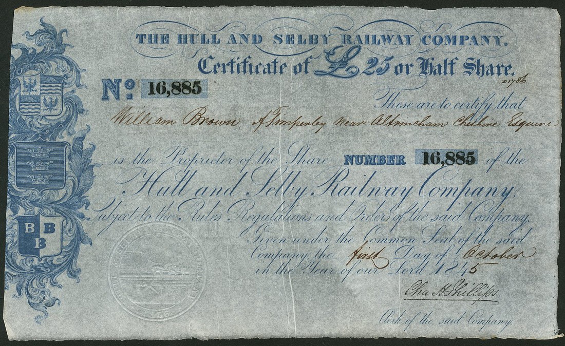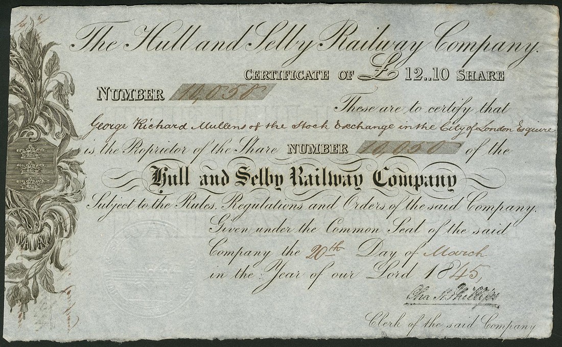 Hull and Selby Railway Company, a pair of certificates, share for £12..10, 18[45], no.10050, floral design to left, black, together with £25 (or half) share, 184[5], no.16885, shields and floral scrolls to left, blue, both about extremely fine. (2)