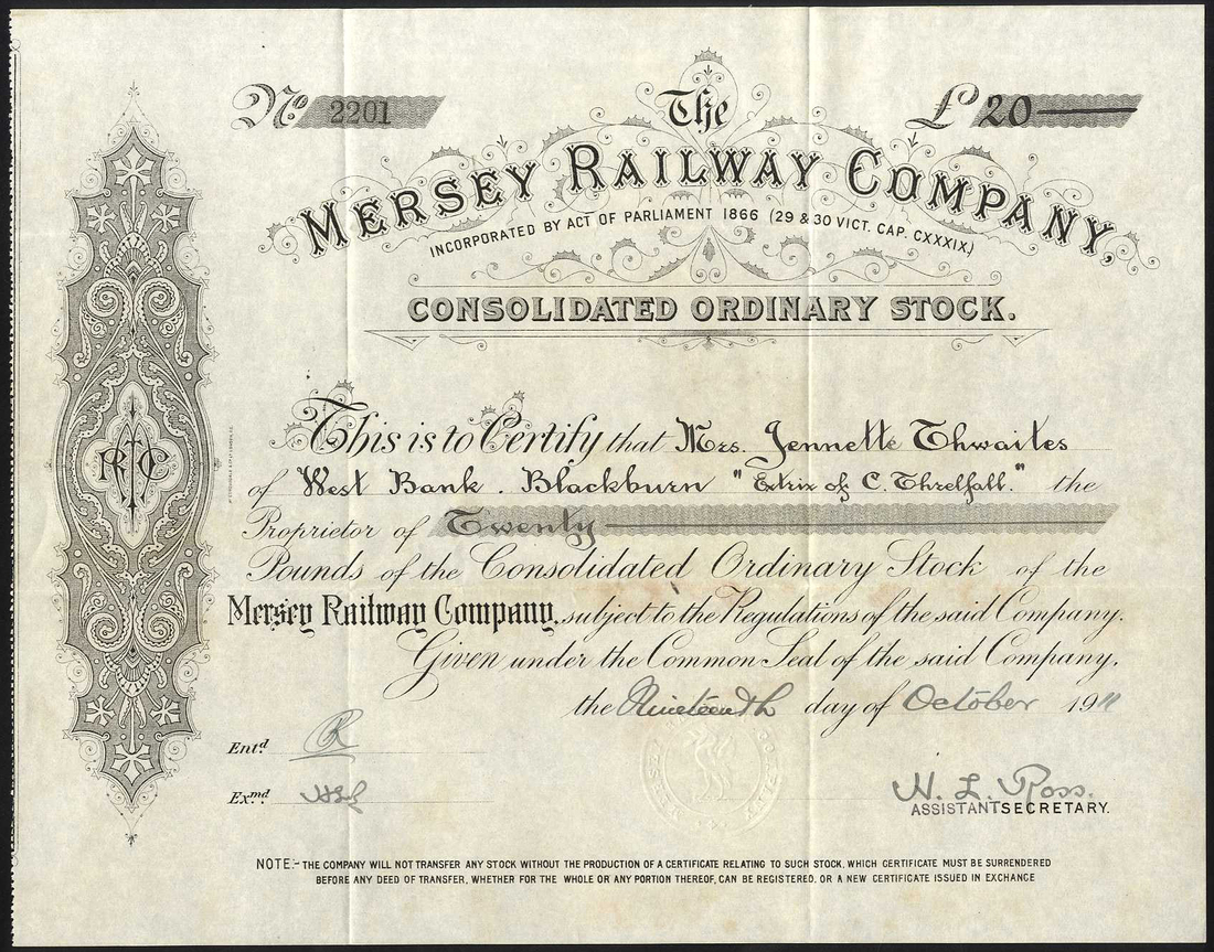 Mersey Railway Company, consolidated ordinary stock certificate, 19[11], no.2201, scrollwork at left, black, with related paperwork, small area of discolouration in centre, good very fine