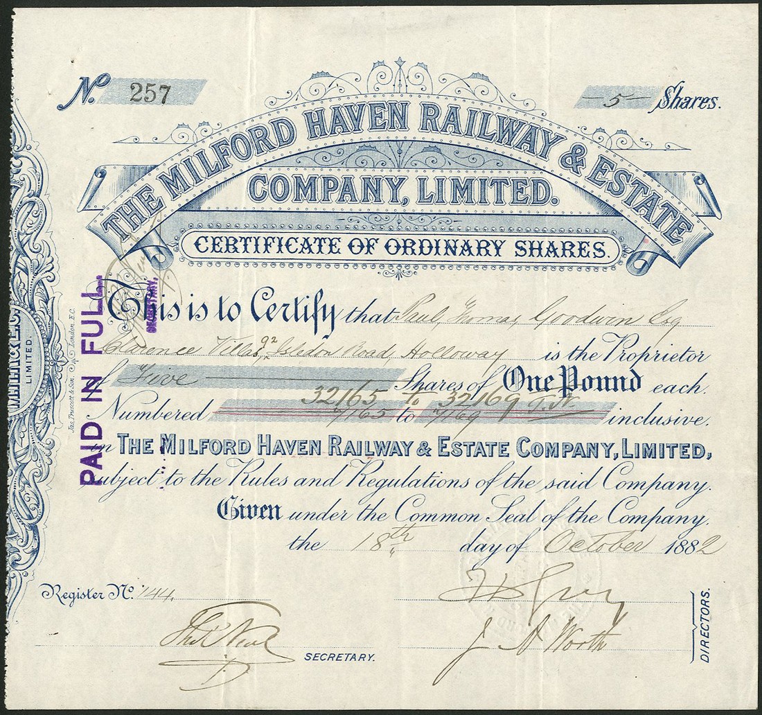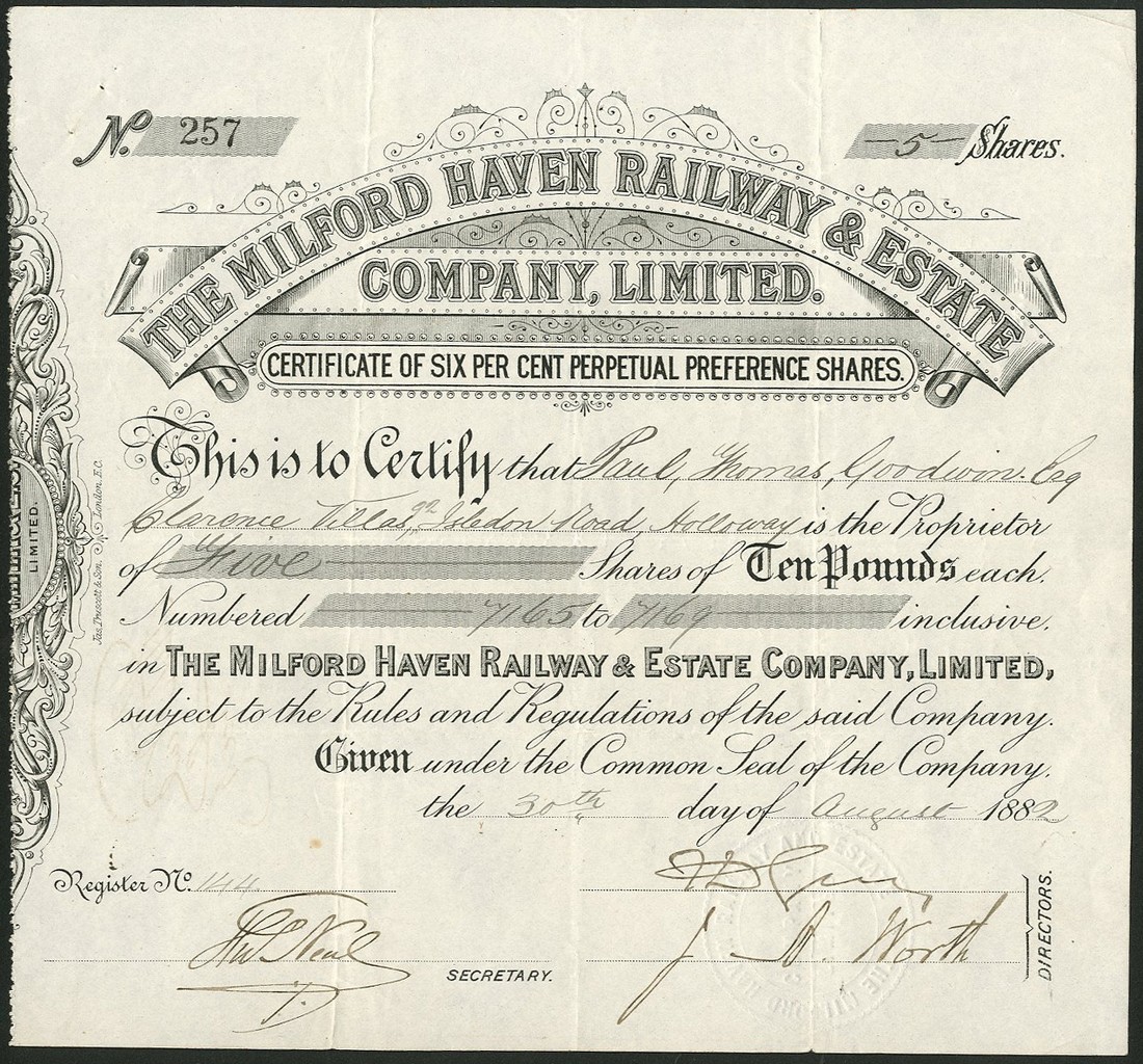 Milford Haven Railway & Estate Co. Ltd., a pair of certificates for £1 ordinary shares and £10 6% perpetual preference shares, both 188[2], both numbered 257, decorative title and scrollwork at left, blue and black respectively, good very fine. (2)