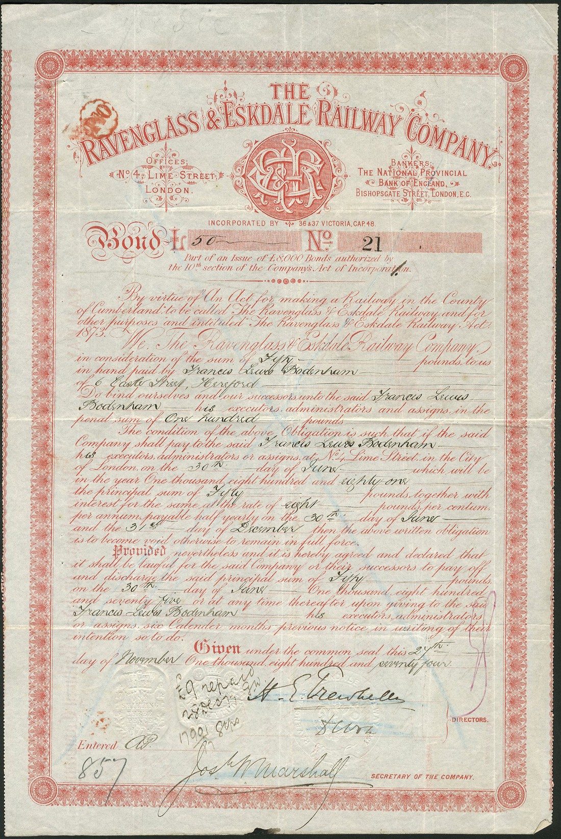 Ravenglass & Eskdale Railway Company, 8% loan, bond for £50, 18[74], no.21, ornate border, company logo at top, red, with coupons (detached), strike through cancelled faintly on face, very fine.