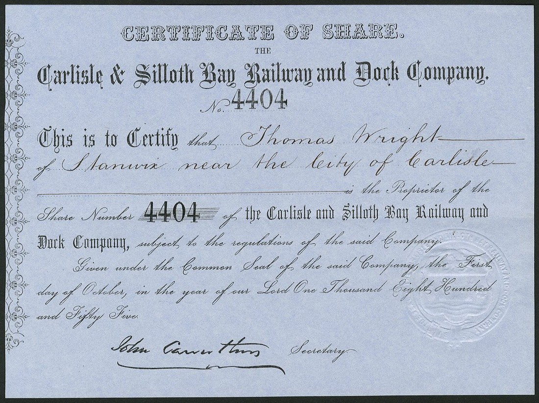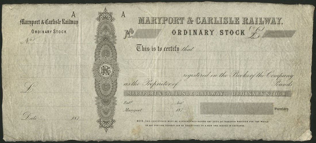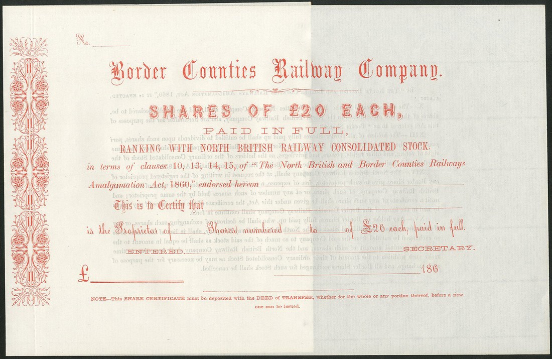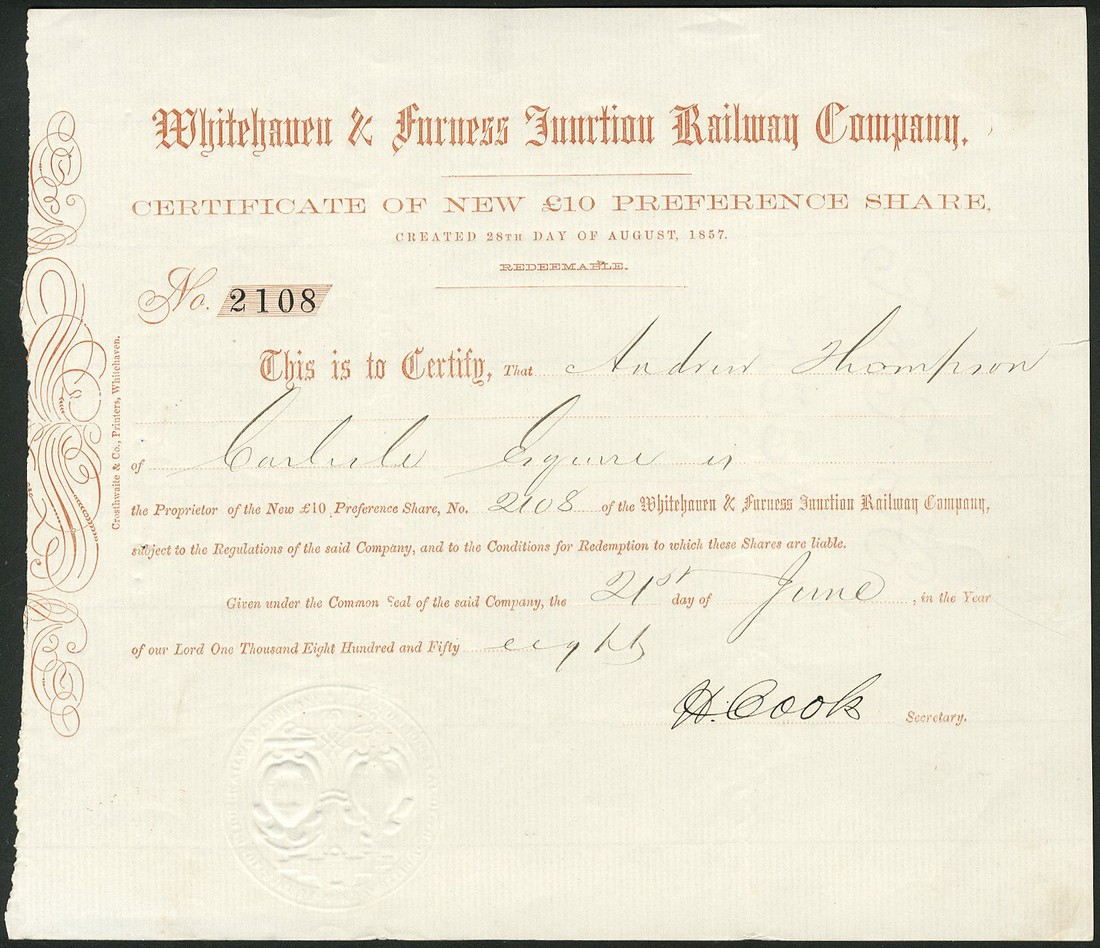 Whitehaven & Furness Junction Railway Co., £10 preference share, 185[8], no.2108, brown, embossed seal at bottom, together with more Cumbrian Railways comprising; Carlisle & Silloth Bay Railway and Dock Co., one share, 1855, and ordinary stock, 18[65]; Cockermouth, Keswick & Penrith Railway Co., two certificates for consolidated stock, 188[3] and 18[94], these only fine and about very fine; Border Counties Railway Co., 5 shares of £20, 185[5], and un-issued £20 shares, 186[-]; and Maryport & Carlisle Railway, un-issued certificates for ordinary stock, 187[-], very fine and better unless stated. (8)