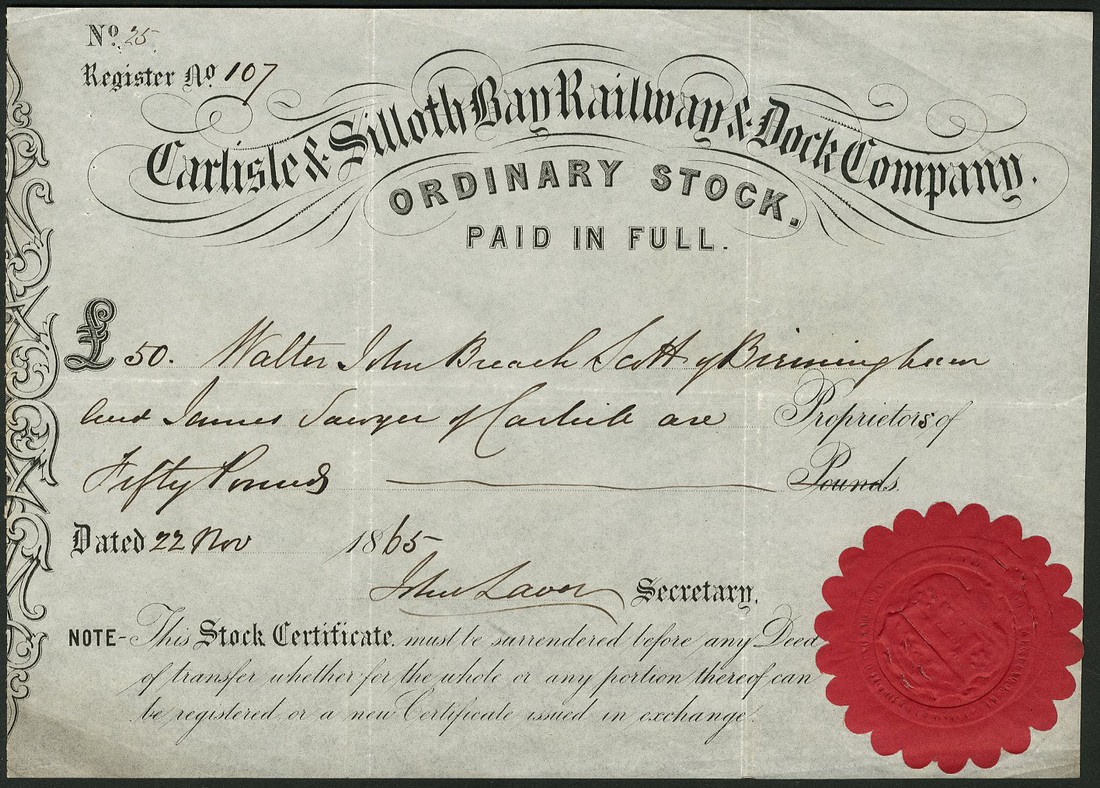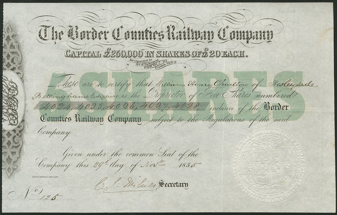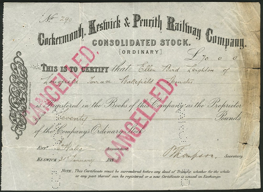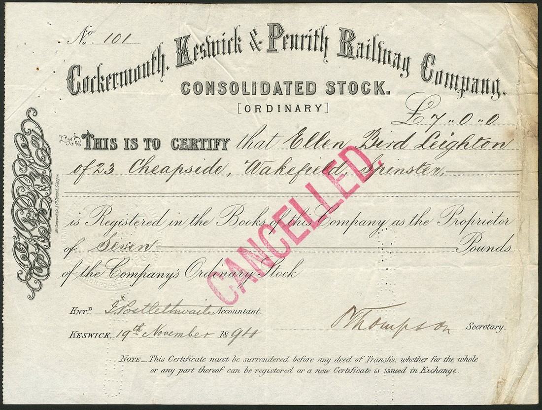 Whitehaven & Furness Junction Railway Co., £10 preference share, 185[8], no.2108, brown, embossed seal at bottom, together with more Cumbrian Railways comprising; Carlisle & Silloth Bay Railway and Dock Co., one share, 1855, and ordinary stock, 18[65]; Cockermouth, Keswick & Penrith Railway Co., two certificates for consolidated stock, 188[3] and 18[94], these only fine and about very fine; Border Counties Railway Co., 5 shares of £20, 185[5], and un-issued £20 shares, 186[-]; and Maryport & Carlisle Railway, un-issued certificates for ordinary stock, 187[-], very fine and better unless stated. (8)