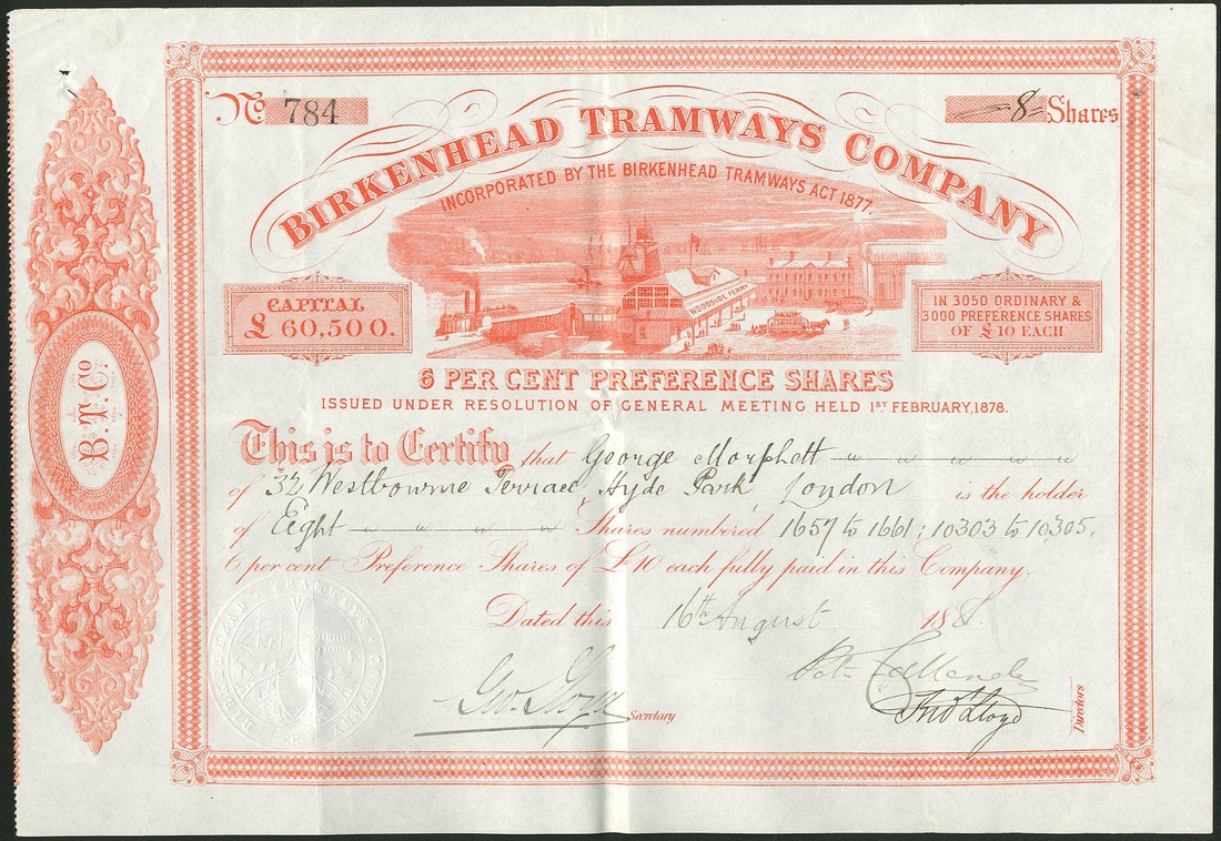 Birkenhead Tramways Company, 6% preference shares of £10, 18[81], no.784, lovely vignette of the Woodside Ferry terminus with horse drawn tram waiting to depart, several ships at the dockside, red, good very fine and scarce.
