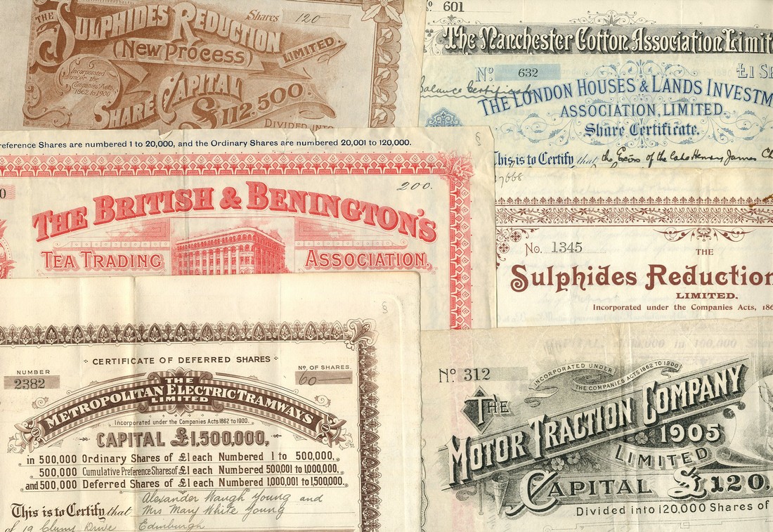 Metropolitan Electric Tramways Ltd., £1 deferred shares, 190[2], brown, together with other British certificates including Motor Traction Co. 1905 Ltd., 190[6]; British & Benington's Tea Trading Association Ltd., 189[902], attractive piece with vignette of building in centre, and Sulphides Reduction (New Process) Ltd., 1899, 1903 and 1904, and others (15), several are very fine, a few better. (21)