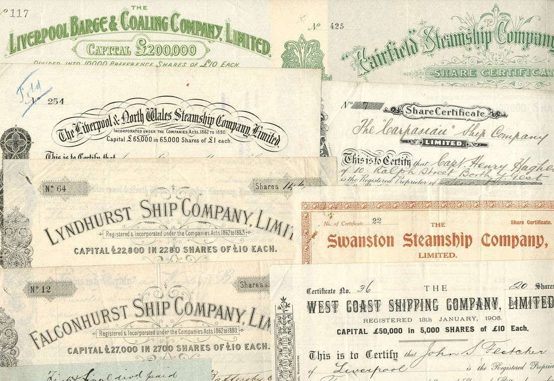 A lovely collection of Shipping certificates, many decorative, comprising; West Coast Shipping Co. Ltd., 190[5]; Swanston Steamship Co. Ltd., 192[4]; Falconhurst Ship Co. Ltd., 188[3]; Lyndhurst Ship Co. Ltd., 188[7]; Liverpool & North Wales Steamship Co. Ltd., 189[1]; Liverpool Barge & Coaling Co. Ltd., 19[11]; "Carpasian" Ship Co. Ltd., 190[5]; "Fairfield" Steamship Co. (1920) Ltd., 1920; Hazlewood Shipping Co. Ltd., 19[20]; Keighley Shipping Co. Ltd., 192[1]; Temperley Steam Shipping Co. Ltd., 19[23]; Steam Ship Tower Hill Co. Ltd., 18[81]; South of England Steamboat Co. Ltd., 19[05], and Keighly Steamship Co. Ltd., 19[29], a couple with filing holes and edge splits otherwise condition generally very fine. (14)