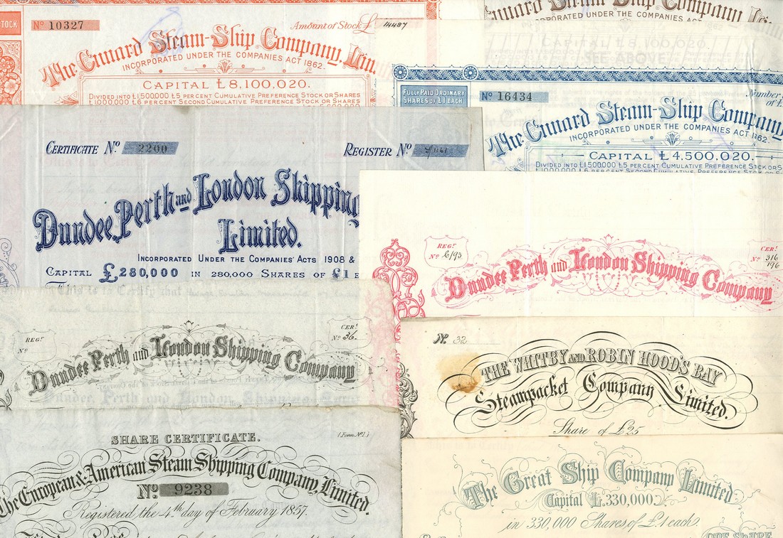 A useful and varied collection of Shipping Companies, wide range of dates from 1850's to 1920's, comprising; Great Ship Company Ltd., 1859; European & American Steam Shipping Co. Ltd., 1857; Staithes Shipping Co., 185[6]; Whitby and Robin Hood's Bay Steam Packet Co., various pieces; Dundee, Perth and London Shipping Co., 4 pieces, dates from 18[68] to 19[24]; Cunard Steam-Ship Co. Ltd., various pieces; White Star Line Ltd., 19[28] and 19[33]; Keighley Shipping Co. Ltd.; Hazelwood Shipping Co. Ltd.; Anglo-Celtic Shipping Co. Ltd., and Western Counties Shipping Co. Ltd., 4 pieces, many decorative, all very fine or thereabouts. (26)