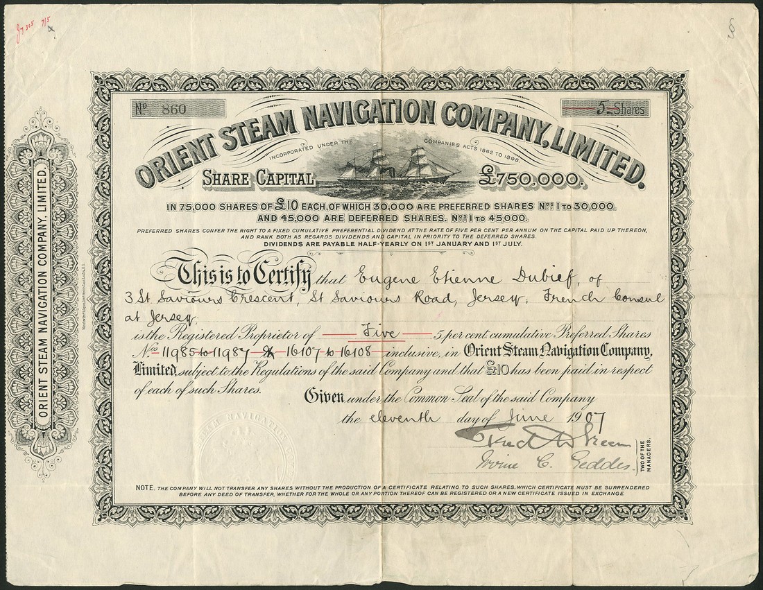 Orient Steam Navigation Co. Ltd., £10 5% cumulative Preference shares, 19[07], no.860, single funnel steamship in centre, ornate border, black, printed by Waterlow, Bros and Layton, heavy vertical centre fold but very fine.