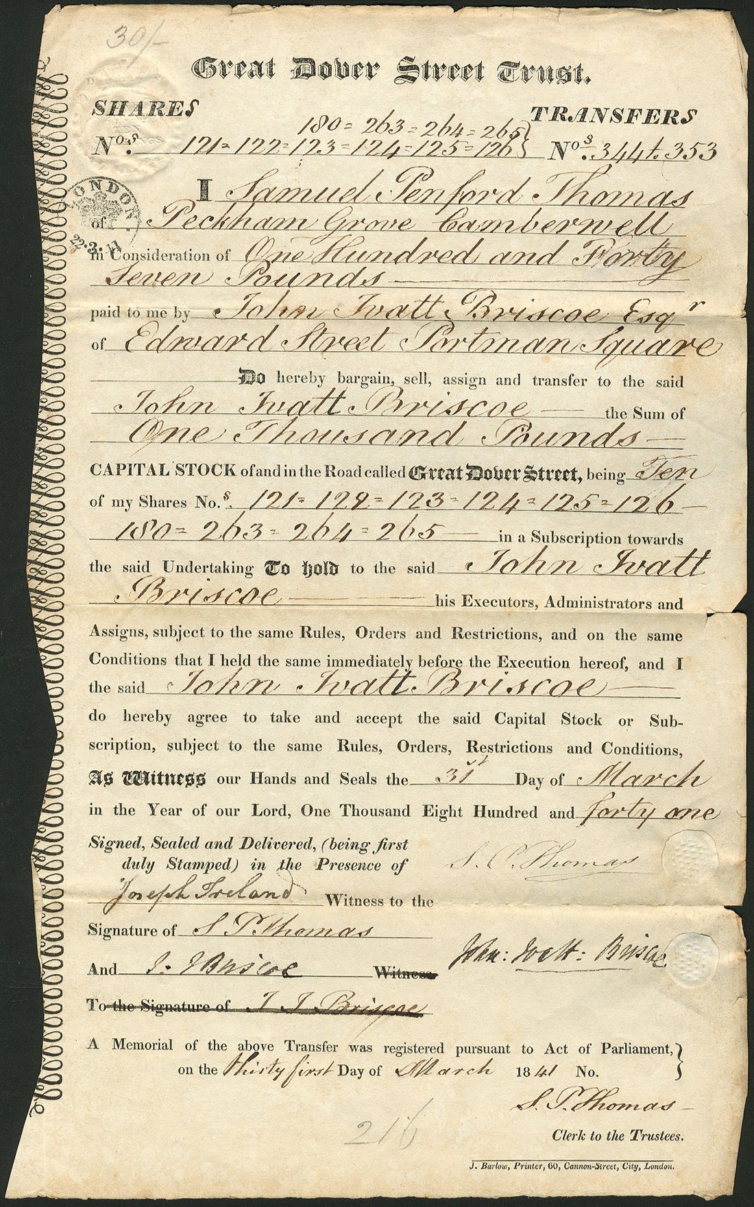 Great Dover Street Trust, share transfer document for [£1000] capital stock, 18[41], black printing on thick paper, scrollwork at left, signatures of transferor and transferee, small tears on folds at right edge, toned, fine to very fine.