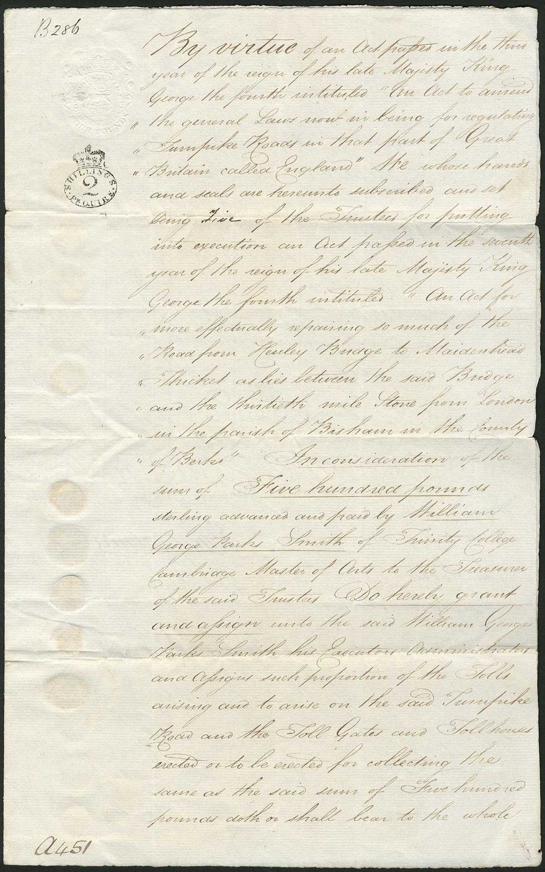 Henley Bridge to Maidenhead Thicket Turnpike Road, a manuscript bond for £500, 1830, issued under Act 'for more effectually repairing so much of the road', 4 pages, signatures of 5 of the trustees, annotated with repayments of part of the principal in 1840 and 1841, blind impressed duty stamp for £4, folds but very fine and scarce.