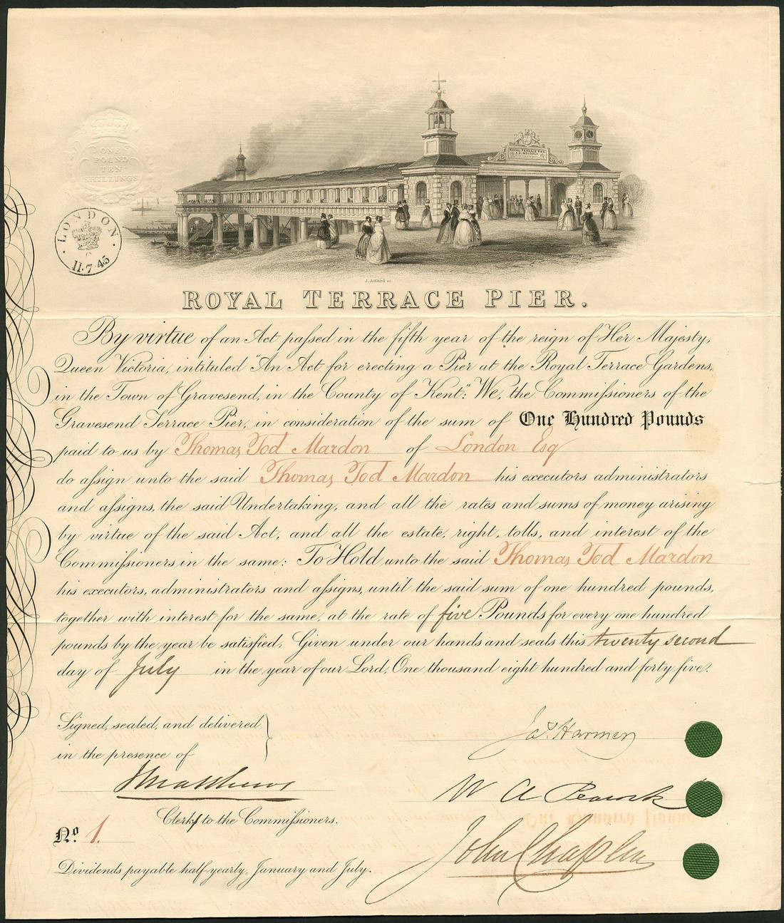 Royal Terrace Pier, Gravesend, certificate no.1 for £100 paying interest at 5%, 1845, beautiful vignette of the pier with a paddle steamer moored at the end, black on buff paper, good very fine and rare.