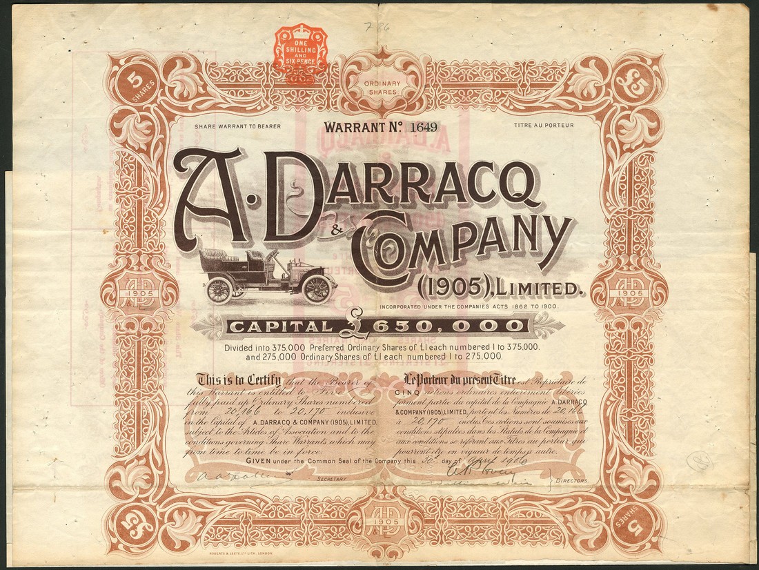 A. Darracq & Company (1905) Ltd., bearer warrant for 5 ordinary shares of £1 each, [1906], no.1649, illustration of the Darracq Car under title, ornate border, brown, text in English and French, with coupons, very fine.