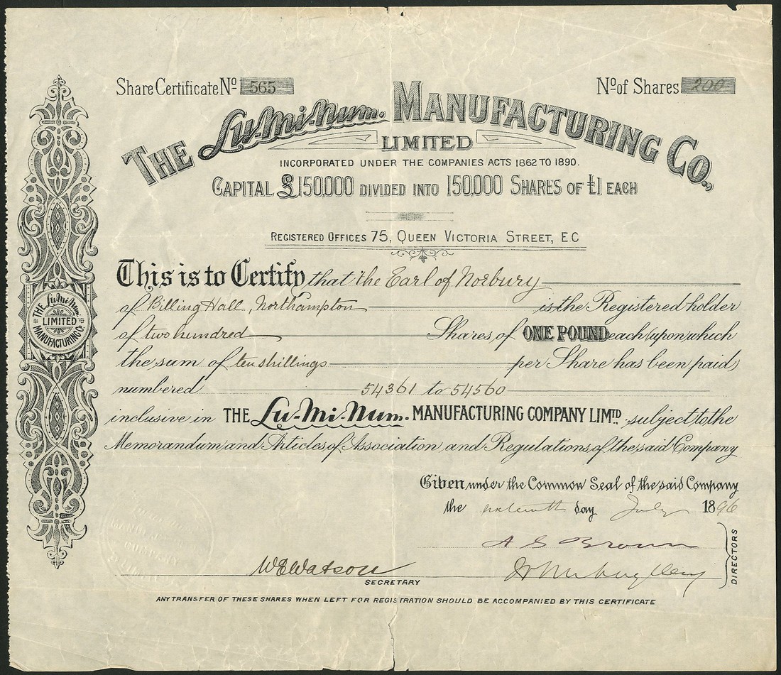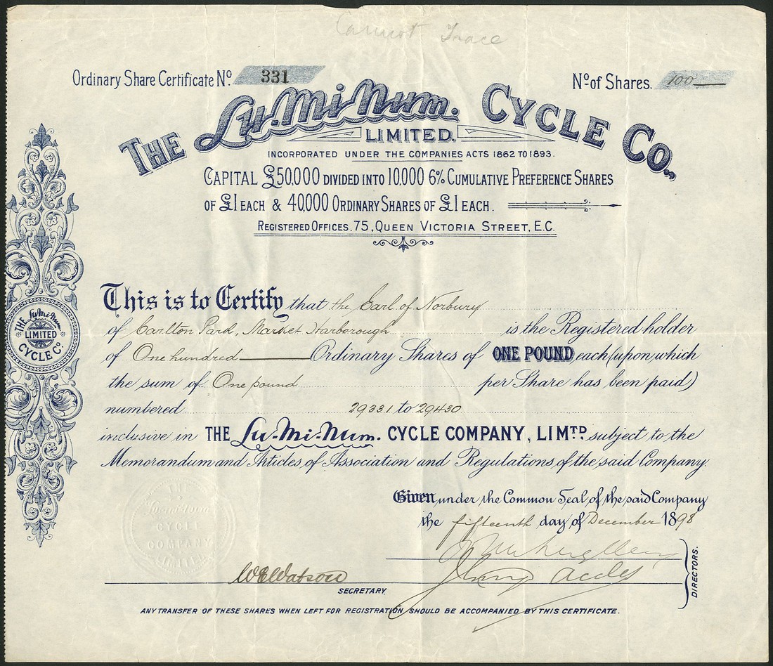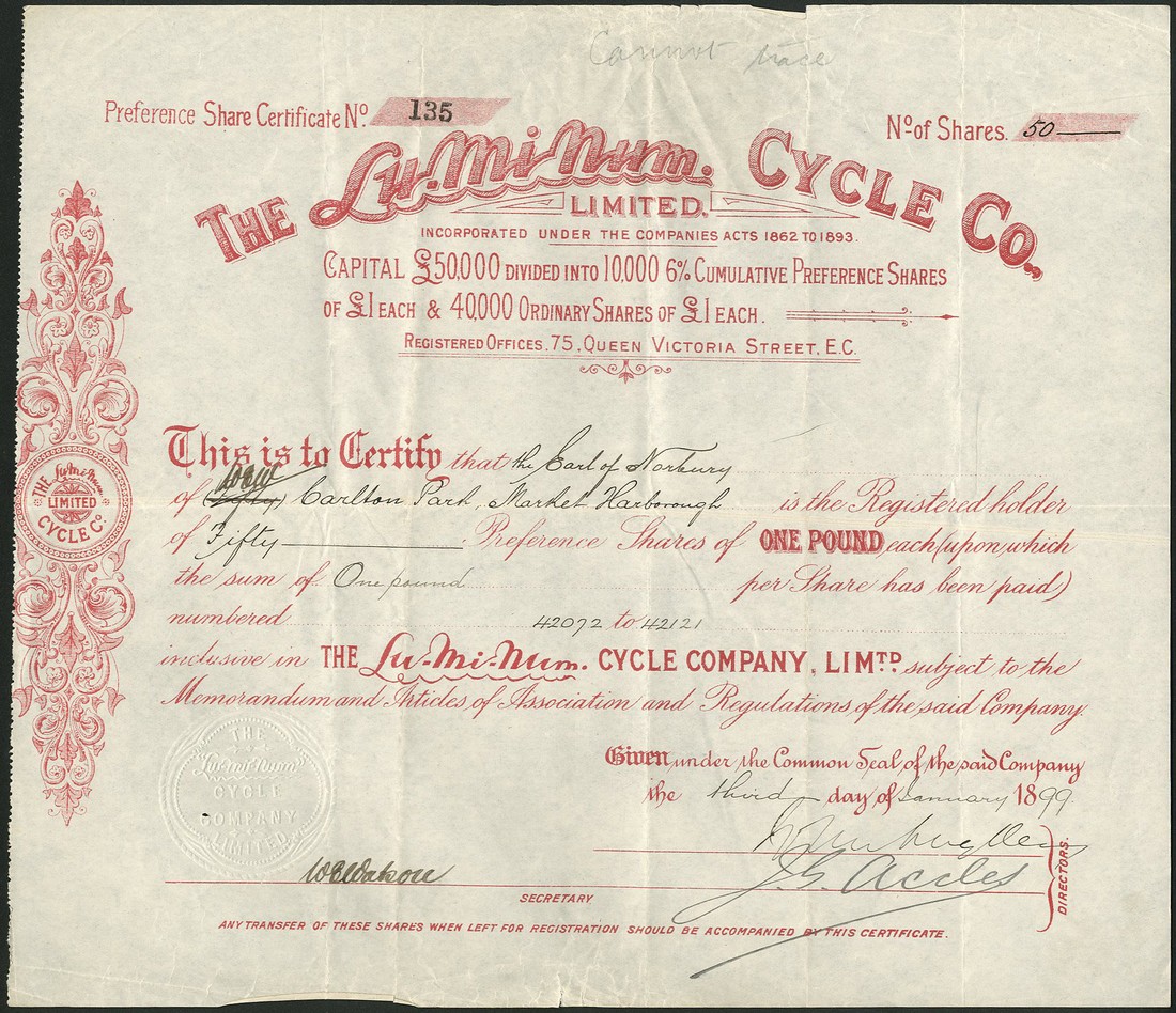 Lu-Mi-Num Manufacturing Co. Ltd., £1 shares, 18[96], black, together with Lu-Mi Num Cycle Co. Ltd., ordinary and preference shares of £1, 18[98] and 18[99], blue and red respectively, all issued to the Earl of Norbury, all with scrollwork at left, the first with tears on centre fold, otherwise light creasing but very fine. (3)