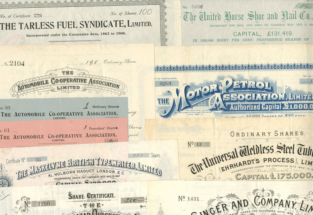 Singer & Co. Ltd., 2/6d ordinary shares, 190[3], no.1431, black, together with other motoring related certificates comprising Universal Weldless Steel Tubes Co. (Ehrhardt's Process) Ltd., 1898; Automobile Co-operative Association Ltd., 1906/09, 3 different types; Motor Petrol Association Ltd., 1915 and Tarless Fuel Syndicate Ltd., 1910, also includes Maskelyne British Typewriter Ltd., 1896 and New Guadalcazar Quicksilver Mines Ltd., 1896, others (5) and a group of defence Regulation certificates, all issued to the earl of Norbury, may very fine. (13+)