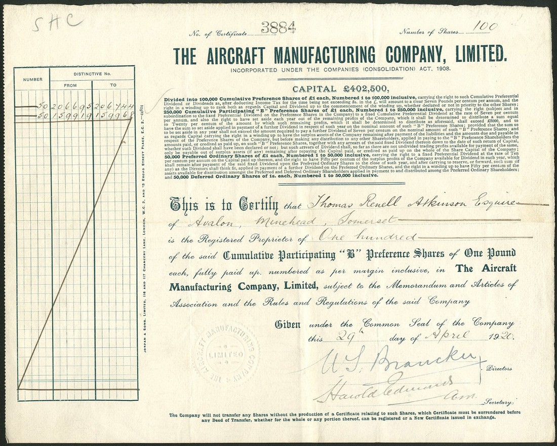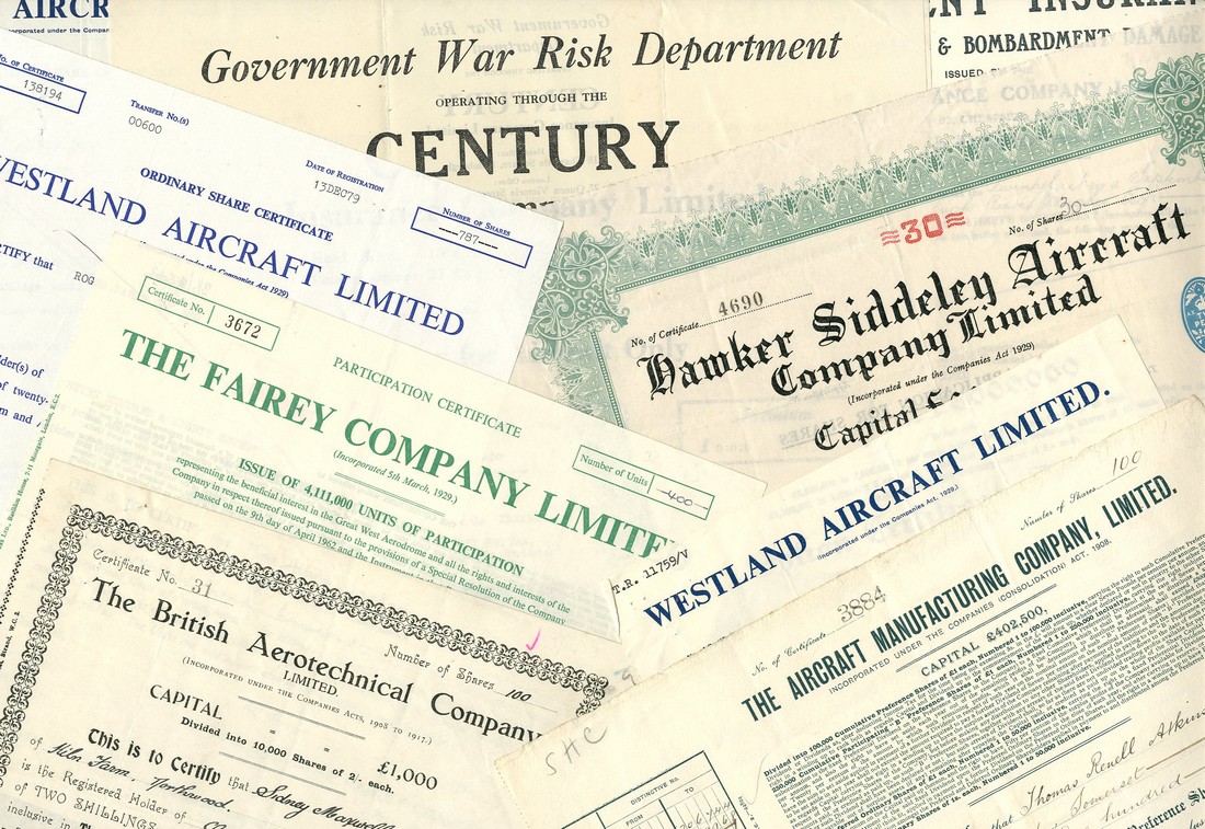 An interesting group of aviation companies, comprising Aircraft Manufacturing Co. Ltd., cumulative participating 'B' shares of £1 each, 19[20], no.3884, green; British Aerotechnical Co. Ltd., 2 shilling shares, 192[9] and another 19[30], black; Hawker Siddeley Aircraft Co. Ltd., option certificate 5 shilling shares, 1938, green and black, 3 examples; Westland Aircraft Ltd., 5 shilling shares, 19[62] and 19[68], and a later example for 25p shares, 1983; Fairey Company Ltd., 1960's and two insurance certificates, generally about very fine. (12)