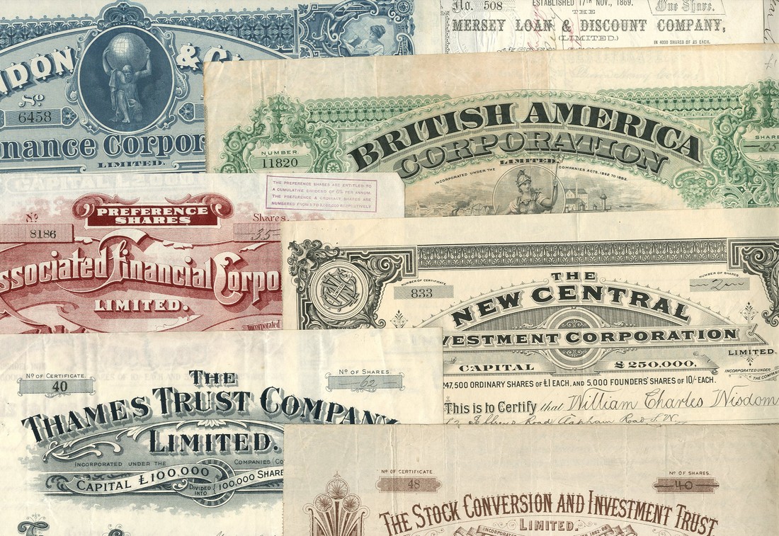 A good collection of Investment and Finance companies, all different, including Stock Conversion and Investment Trust Ltd., 1 shilling shares, 18[91], brown; Thames Trust Co. Ltd., £1 shares, 19[12], blue-black; New Central Investment Corporation Ltd., £1 shares, 189[8], black; Associated Financial Corporation Ltd., 10 shilling preference shares, 190[0]; British America Corporation Ltd., £1 shares, 189[9]; London & Globe Finance Corporation Ltd., £1 shares, 189[7]; Mersey Loan & Discount Co. Ltd., £5 share, 18[70]; Northern Counties Reversionary Interest & Investment Co. Ltd., 18[76] and 18[87]; Northern Investment & Discount Co. Ltd, 1866, and others, fine to very fine at best. (15)