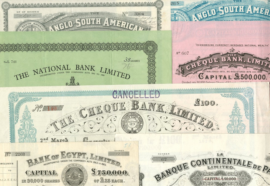 A small group of Banking companies, comprising Bank of Egypt Ltd., £25 shares, 190[2], black; Banque Continentale de Paris Ltd., £4 shares, 1903; Cheque Bank Ltd., founders shares, 189[6], and £100 bond, 1876; National Bank Ltd., £5 shares (over written with £1), 19[50], and Anglo-South American Bank Ltd., £10 shares, 19[09] and another 19[34], and £1 'B' shares, 19[30], all very fine or thereabouts. (8)