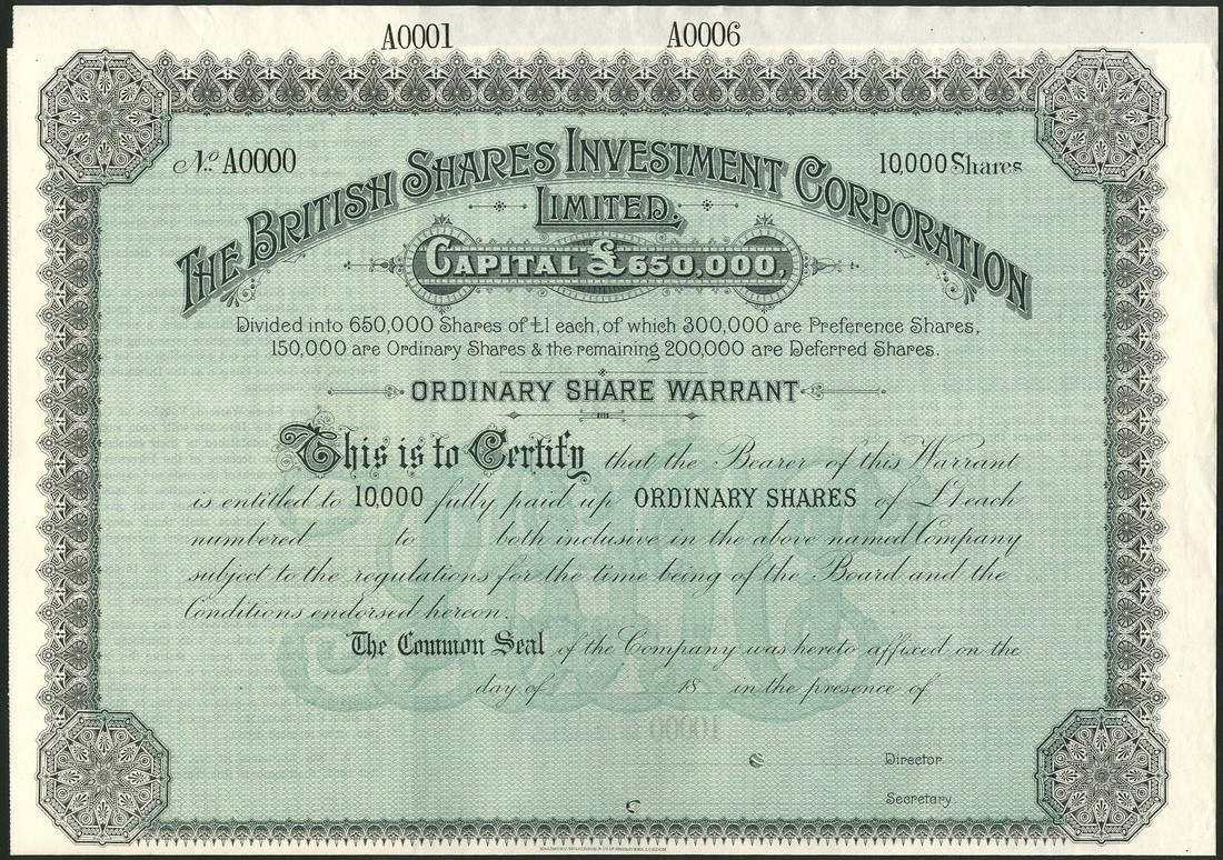 British Shares Investment Corporation Ltd., a group of specimen certificates from the Bradbury, Wilkinson & Co. archive, comprising ordinary share warrants (6), green; preference shares (9), blue; and deferred shares (10), pink, all different showing the complete run of denominations and the numbering sequence, but the 5 and 10 ordinary shares numbered between A315 and A824 are missing, all with ornate borders, with coupons and counterfoil, extremely fine. (25)