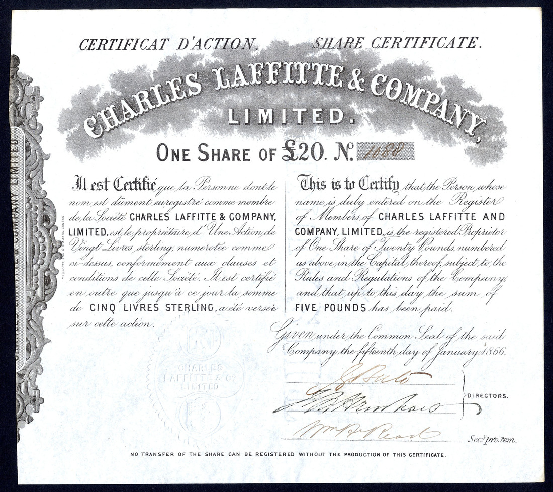 Charles Lafitte & Co. Ltd., a group of 100 certificates for one £20 share, 1866, fully issued with all signatures and with embossed seal, scrollwork at left, black, text in English and French, very fine to extremely fine. (100)