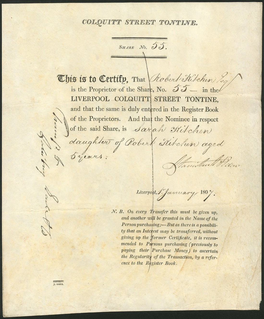 Liverpool Colquitt Street Tontine, certificate of one share, 180[7], no.55 black printing, on vellum, ink cancelled, slightly yellowed vellum, good very fine.