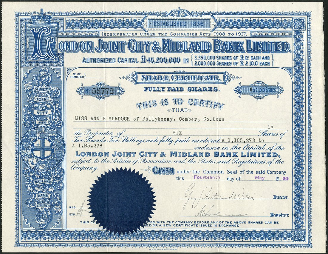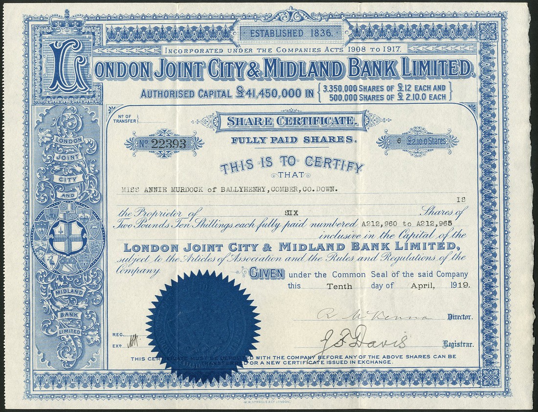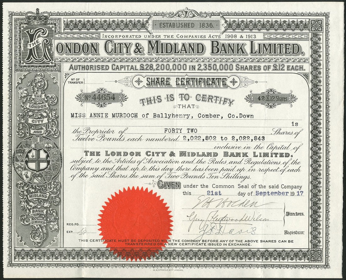 London City & Midland Bank Ltd, £12 shares, 19[17], capital £28,200,000, together with London Joint City & Midland Bank Ltd., a pair of certificates for £2 10s shares, 19[19], capital £41,450,000, and 19[20], capital £45,200,000, all with ornate border and arms at left, black with red seal and blue with blue seal respectively, good very fine and a scarce group. (3)
