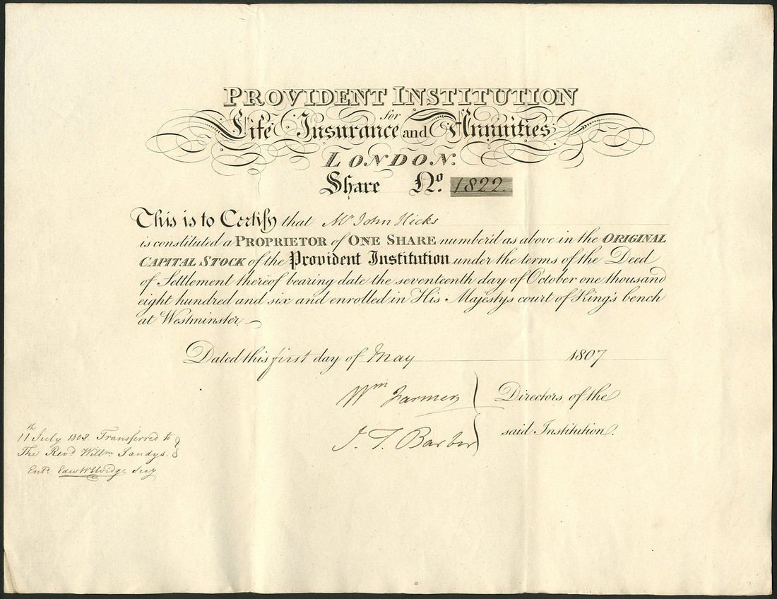 Provident Institution for Life Insurance and Annuities, a group of 4 certificates for one share, 180[7], no.1819-1822, black printing, hand written transfer details at bottom left, very fine. (4)