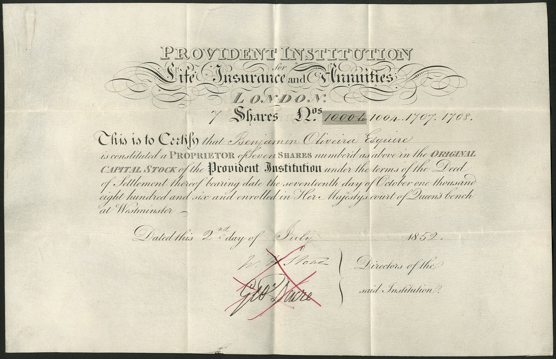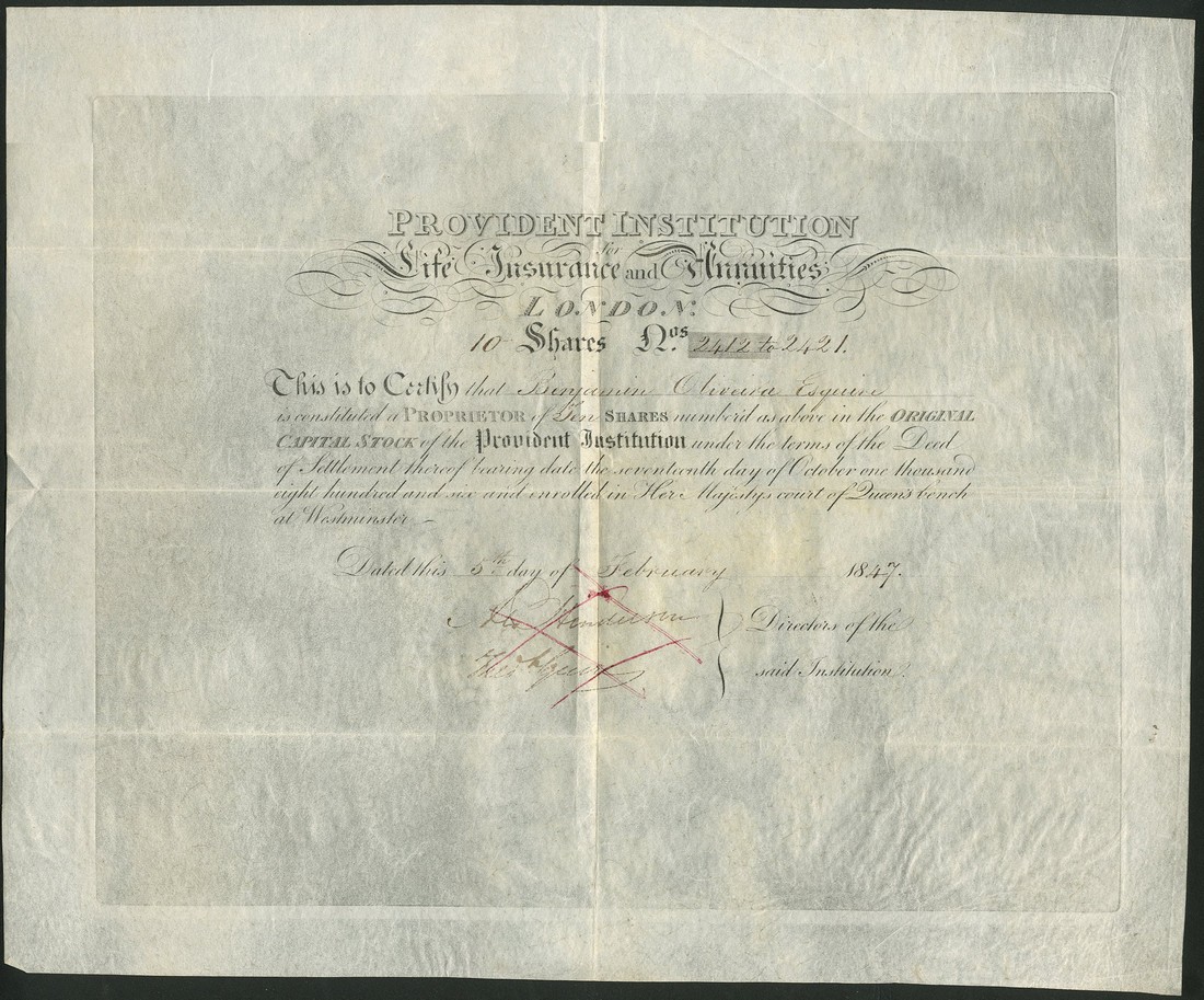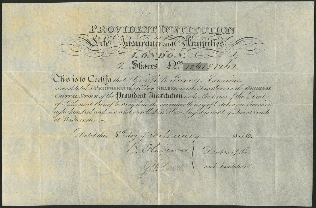 Provident Institution for Life Insurance and Annuities, a group of 3 certificates for shares of original capital stock, 18[47], 18[56] and 18[57], together with transfer documents, black printing, all on vellum, the first on extra large sheet showing plate impression, first and last with ink cancellation through signatures, all very fine and more scarce than the paper issues of 1807. (3)