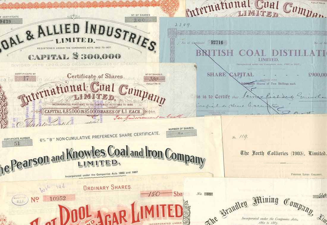 A small collection of British mining companies, including Brandley Mining Co. Ltd., £1 shares, 188[8], no.46, black; East Pool and Agar Ltd., 5 shilling shares, 19[28], and 5 shilling shares, [1931], capital amended to £300,000 from £250,000, both red; Pearson and Knowles Coal and Iron Co. Ltd., 6% 'B' non-cumulative preference shares of 10 shillings each, 19[29], black, and others, some very small nicks, some with pin holes, about very fine throughout.(10)