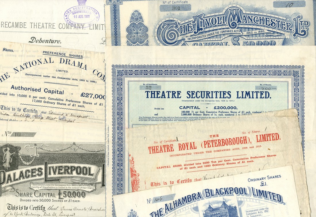 A group of British theatre companies, early 20th century mainly, a few earlier, mostly share certificates but some debentures comprising; Theatre Royal (Peterborough) Ltd., 19[14], No. 1; Theatre Securities Ltd., 19[28]; Tivoli, Manchester Ltd., 189[6]; Alhambra (Blackpool) Ltd., 189[9], with attractive vignette of the theatre; Palaces Liverpool Ltd., 190[2]; National Drama Company Ltd., [1900]; Morecambe Theatre Company Ltd., 190[1]; Lyceum Theatre Ltd., [1899]; Liverpool Repertory Theatre Ltd., 1921; Lyceum Liverpool, 19[47]; Liverpool Lyceum, 1[902]; General Theatre Corporation Ltd., 19[52]; Dominion Theatre Ltd., 19[28], and Associated County Halls & Theatres Ltd., 19[12], 2 examples, fine to very fine. (15)