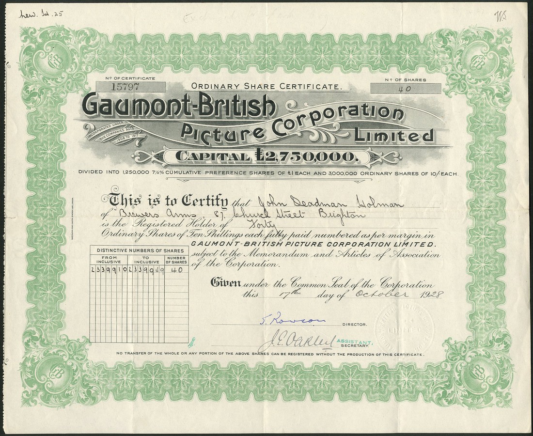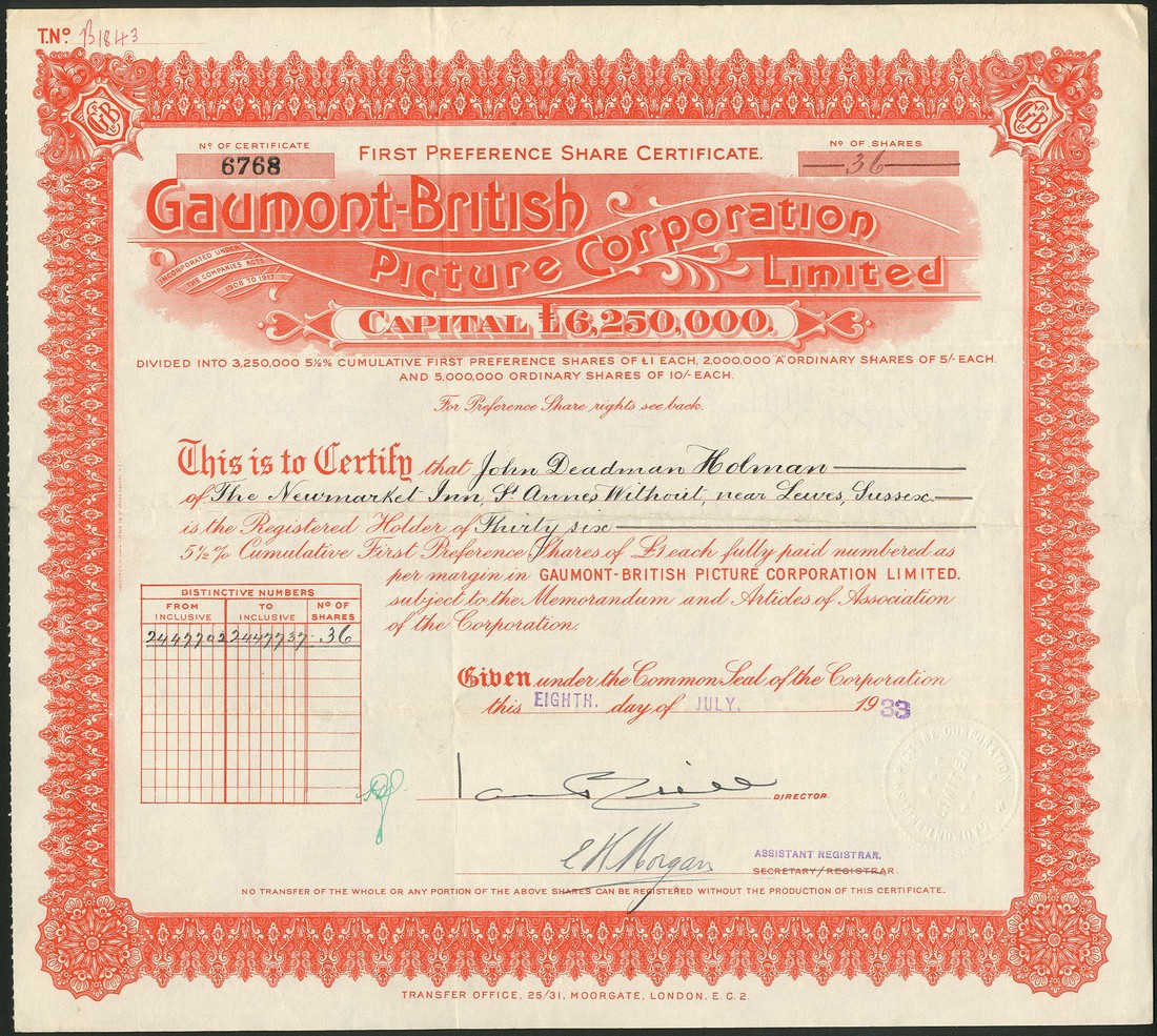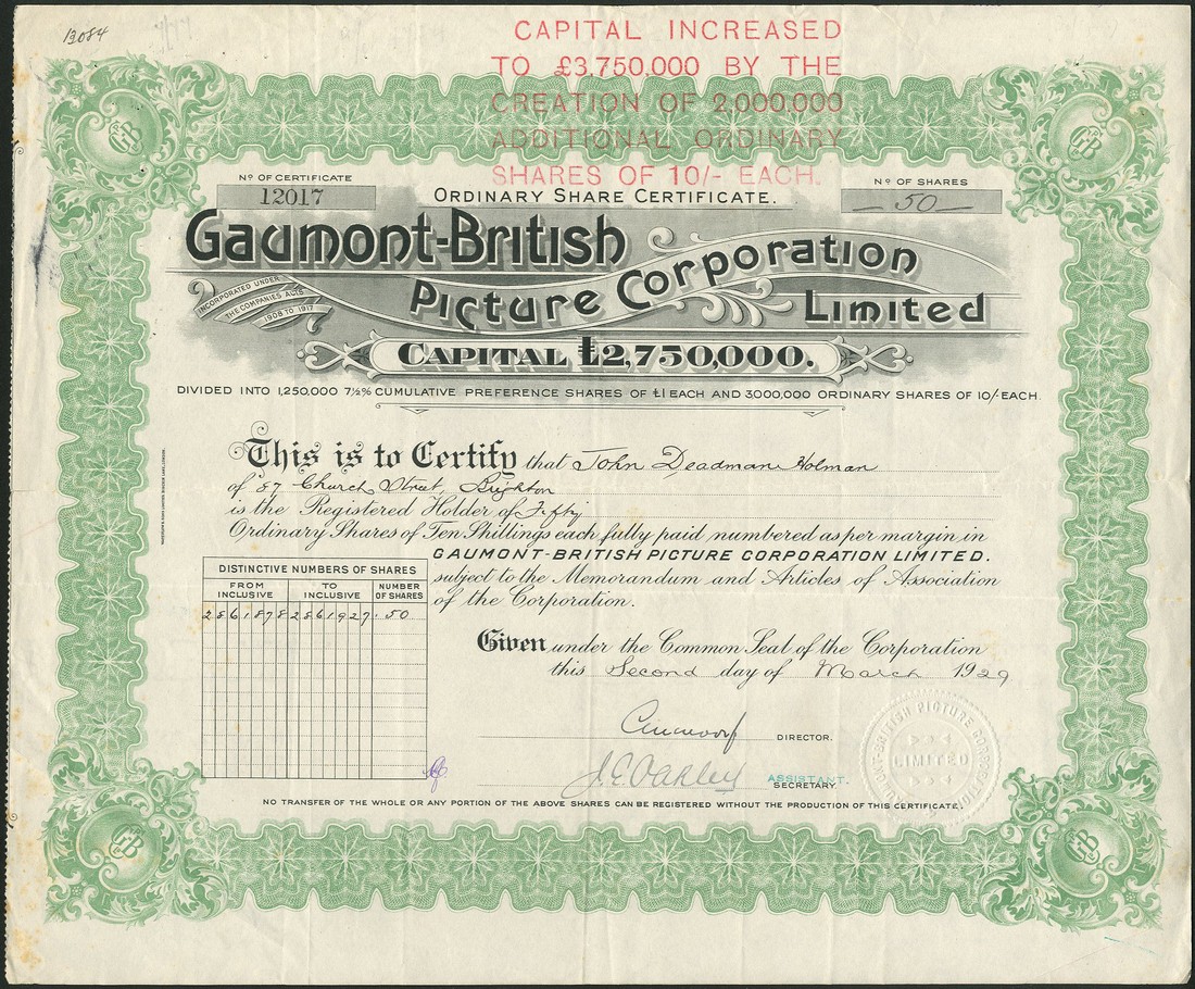 Gaumont-British Picture Corporation Ltd., 5½% cumulative first preference shares of £1, 19[33], red, together with 10 shilling ordinary shares, 19[28] and 19[29], the latter with capital overprinted from £2,750,000 to £3,750,000, green and black, these printed by Waterlow & Sons, all with ornate border, very fine. (3)