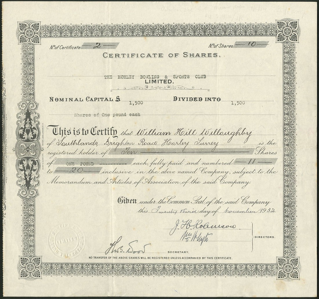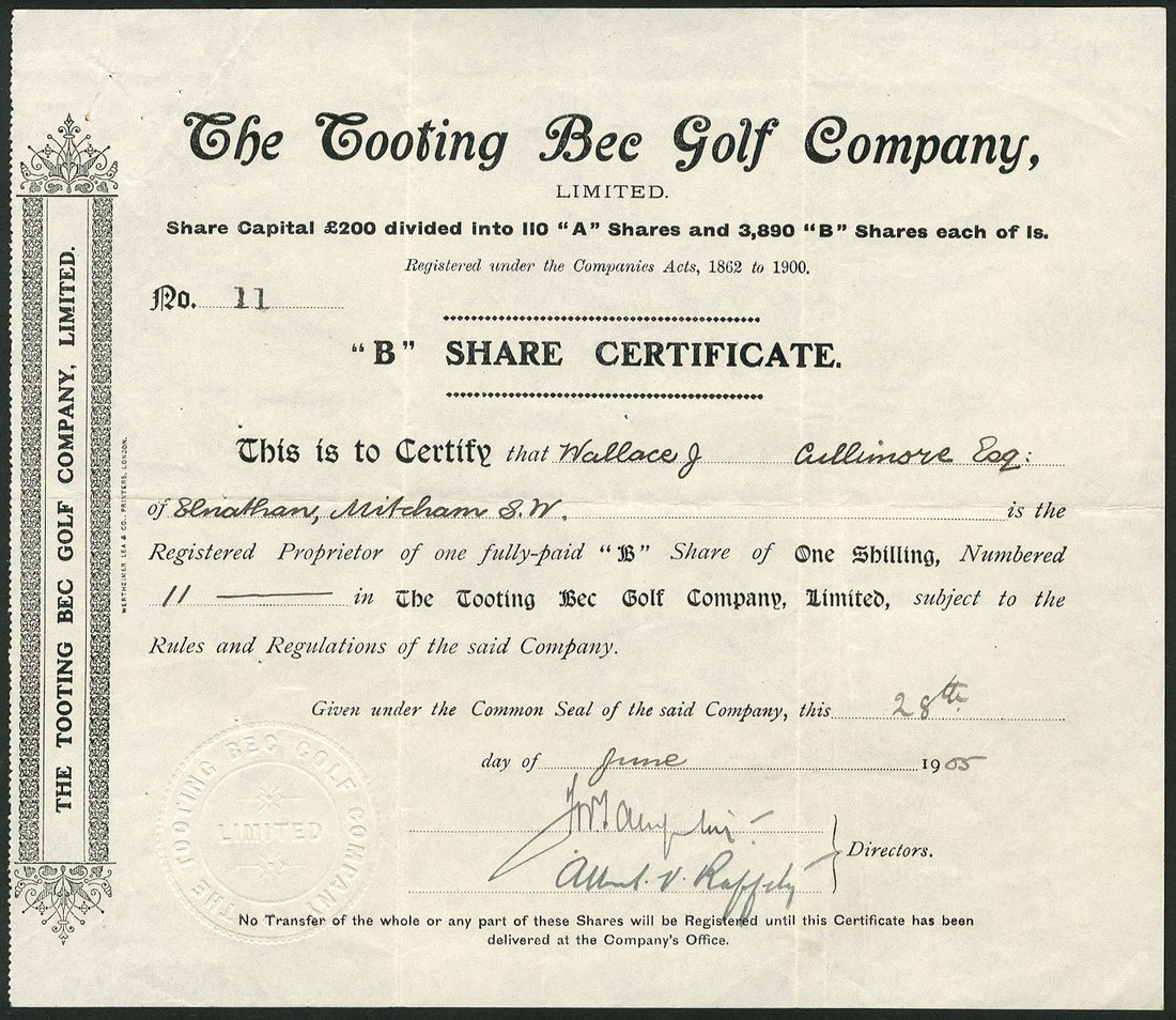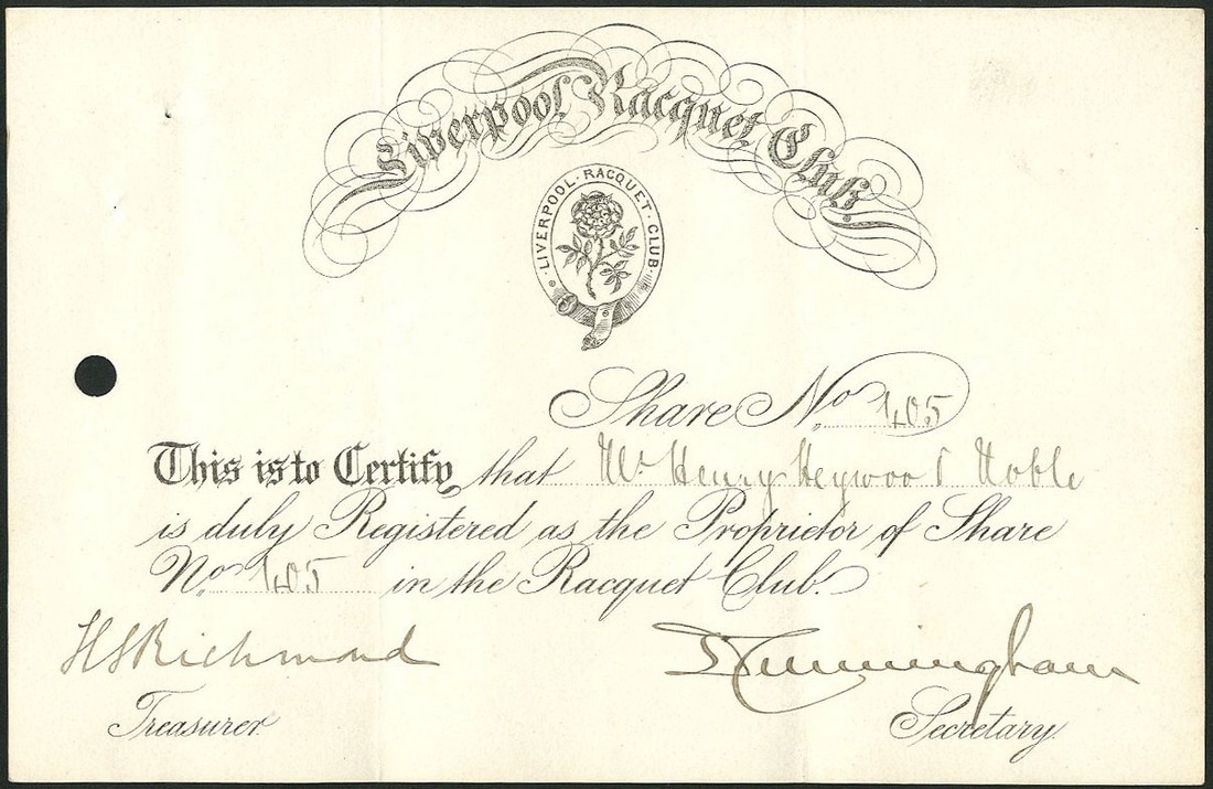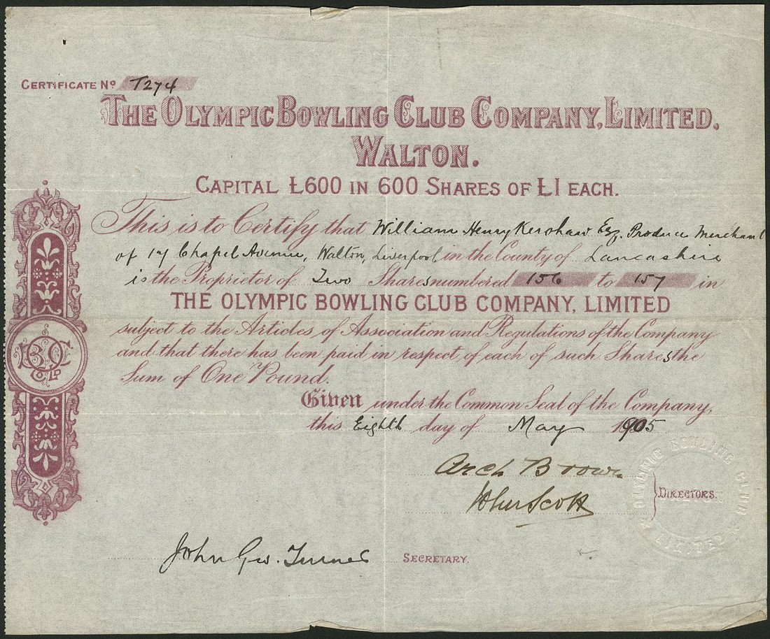 Liverpool Racquet Club, certificate for one share, no.405, no date, circa 1880, small format with decorative title, black, together with several more sport and recreation companies comprising; Tooting Bec Golf Co. Ltd., two certificates for A and B shares of 1 shilling each, both 19[05], mauve and black respectively; Liverpool Masonic Bowling Club Ltd., one share, 193[9], black; Handsworth Wood Bowling Club Ltd., £1 shares, 1901; Olympic Bowling Club Co. Ltd., Walton, £1 shares, 1[905], and Horley Bowling & Sports Club Ltd., £1 shares, 19[32], generally very fine. (7)