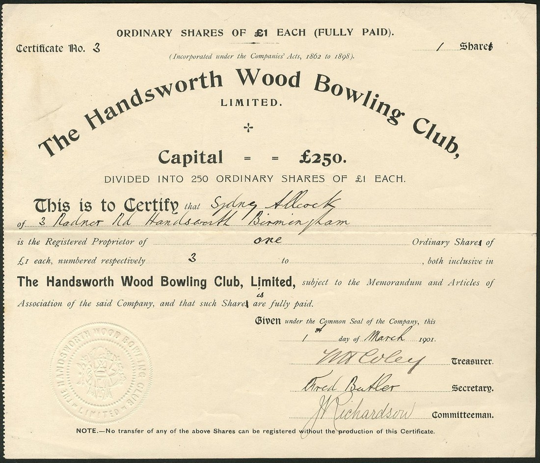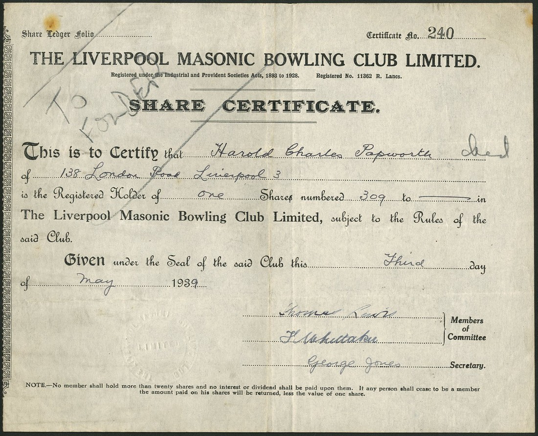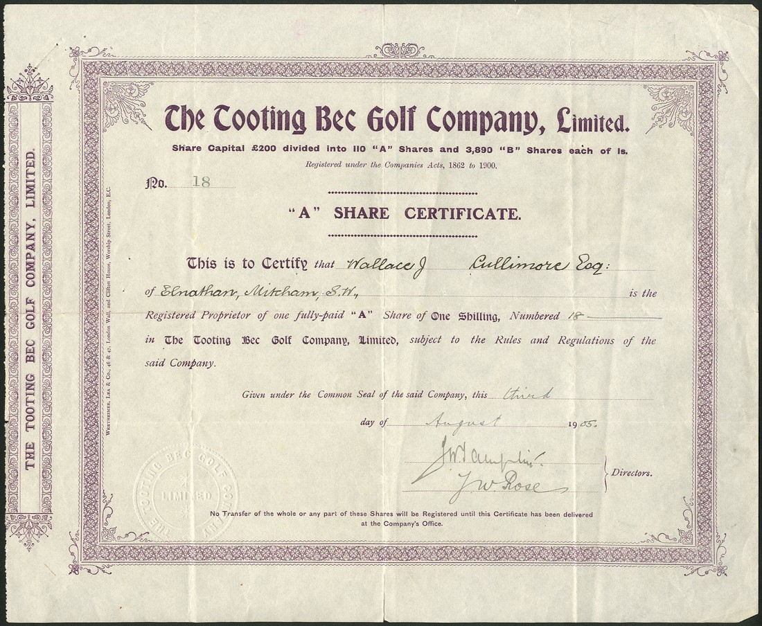 Liverpool Racquet Club, certificate for one share, no.405, no date, circa 1880, small format with decorative title, black, together with several more sport and recreation companies comprising; Tooting Bec Golf Co. Ltd., two certificates for A and B shares of 1 shilling each, both 19[05], mauve and black respectively; Liverpool Masonic Bowling Club Ltd., one share, 193[9], black; Handsworth Wood Bowling Club Ltd., £1 shares, 1901; Olympic Bowling Club Co. Ltd., Walton, £1 shares, 1[905], and Horley Bowling & Sports Club Ltd., £1 shares, 19[32], generally very fine. (7)