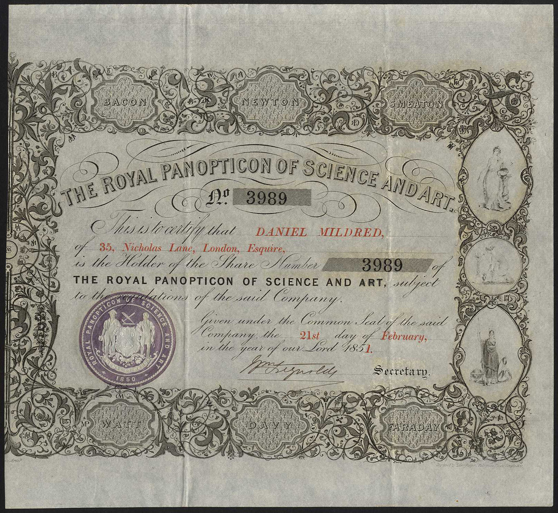 Royal Panopticon of Science and Art, certificate for one share, 185[1], no.3989, issued to Daniel Mildred, partner in the private Bank of Mastermans in London, very ornate border with small vignettes of allegorical figures, names of famous scientists in medallions such as Newton, Watt, Faraday and Davy, black, mauve embossed seal, good very fine.