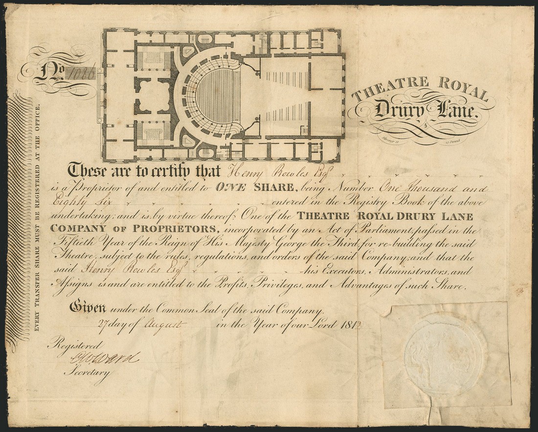 Theatre Royal, Drury Lane, certificate for 1 share, 181[2], no.1086, large plan of the theatre at top left, title to right, black on thick paper, paper seal at bottom right, some surface dirt and trifolded but otherwise very fine.