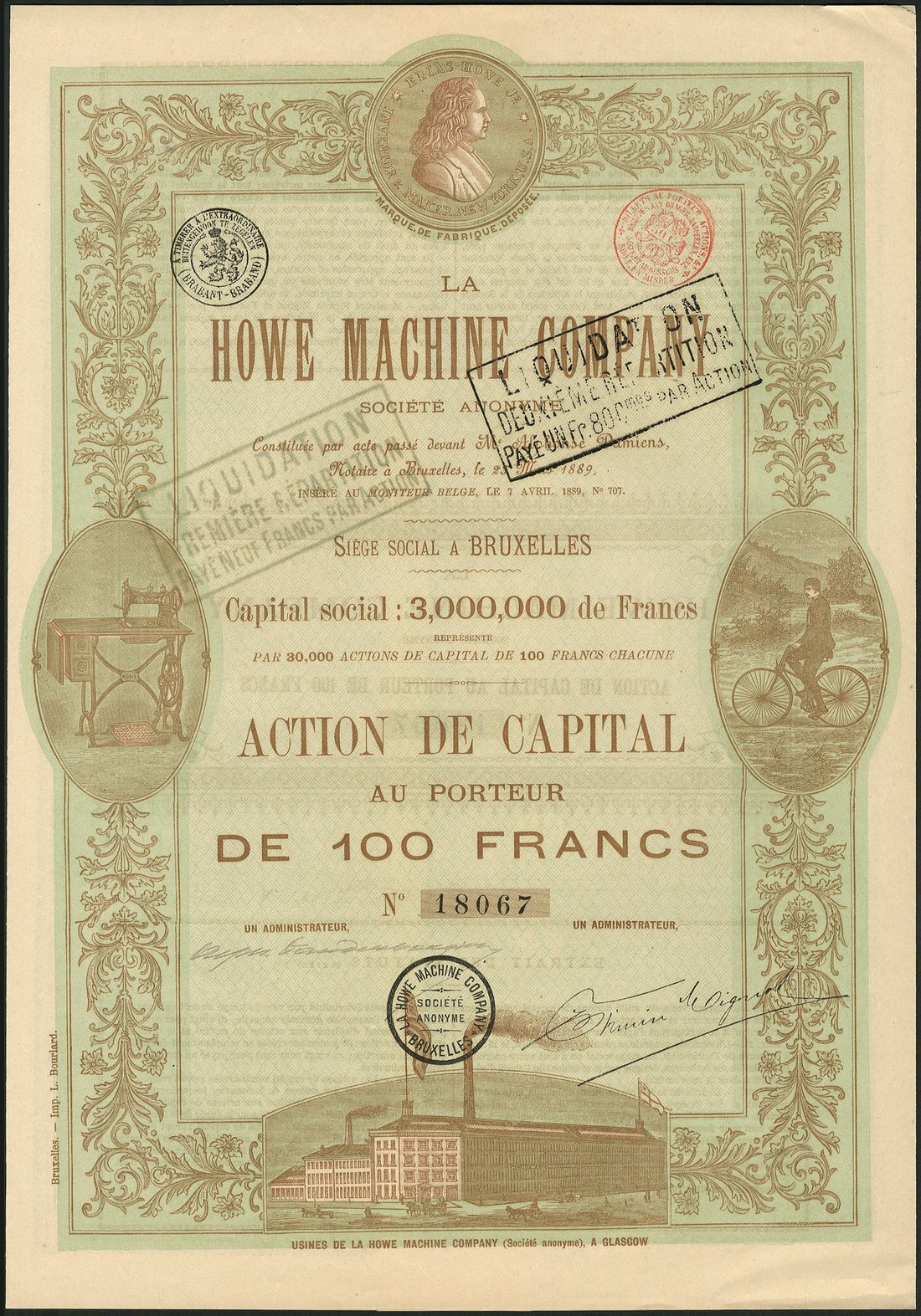 Howe Machine Company S.A., 100 franc share, Brussels 1889, no.18067, the company's Glasgow factory at bottom, sewing machine and cyclist at left and right, Elias Howe, the inventor, medallion at top, brown and green, with all coupons, about extremely fine.