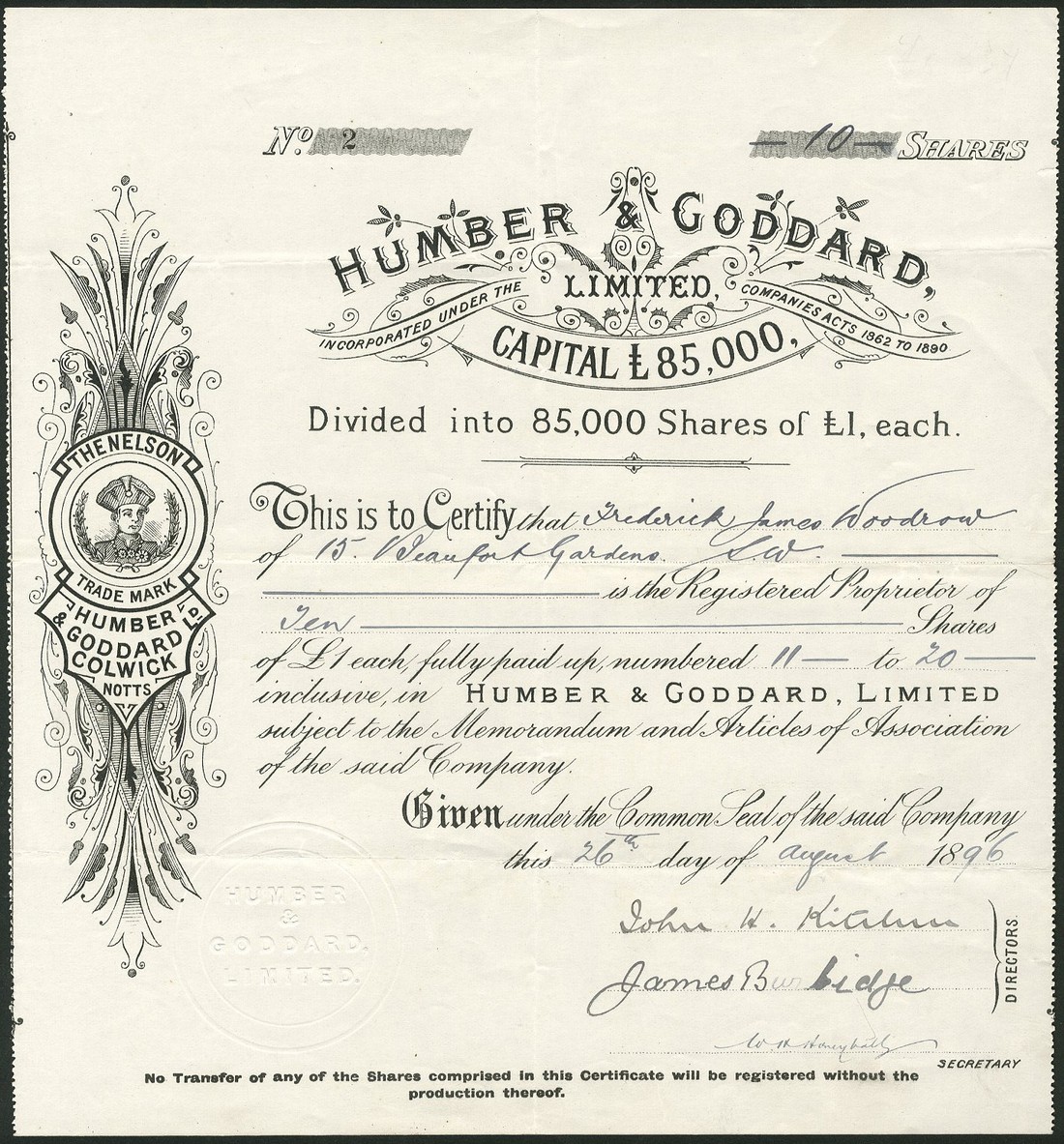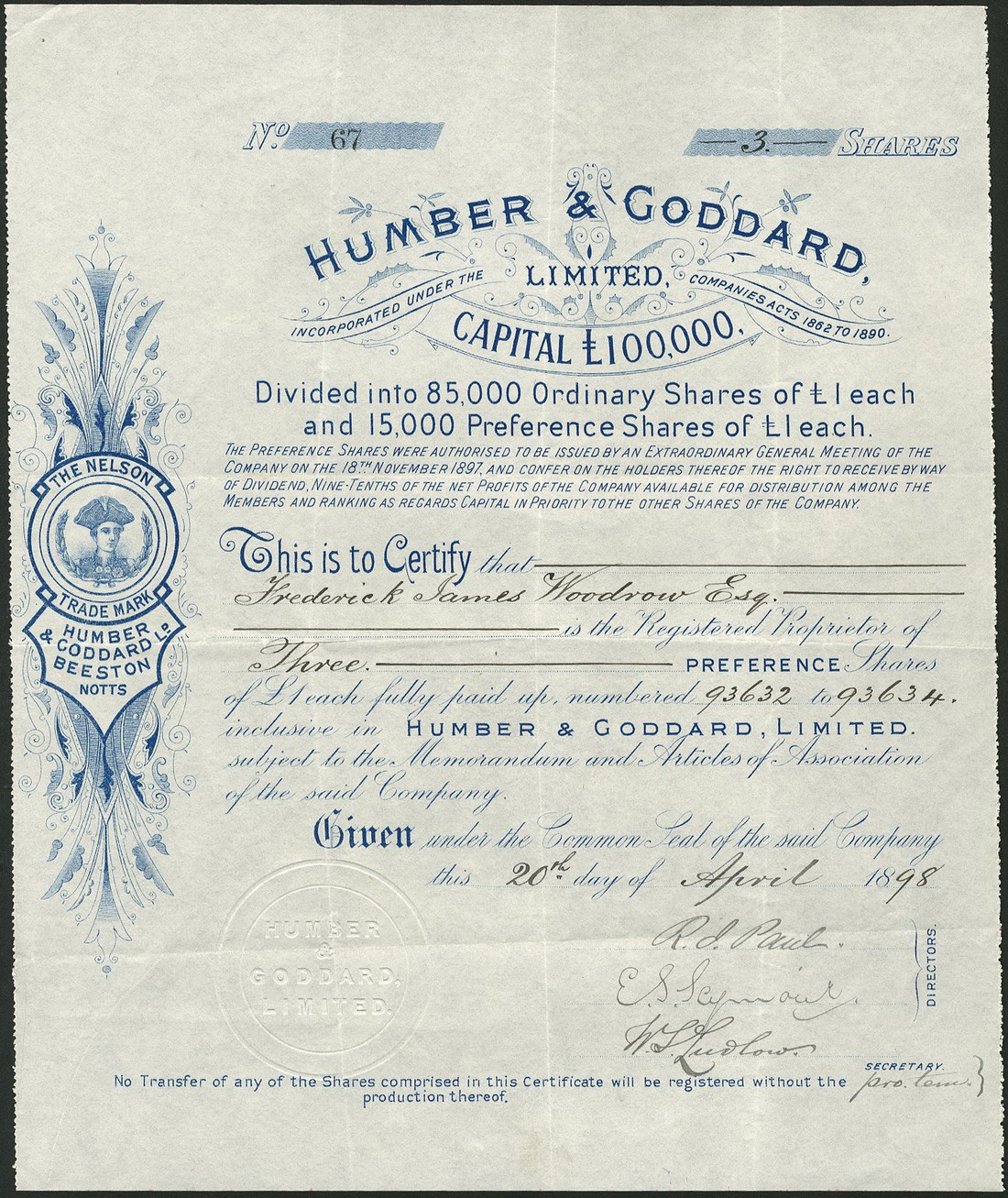 Humber & Goddard Ltd., a pair of certificates, £1 shares, 18[96], no.2, and £1 preference shares, 18[98], no.67, decorative title and scrollwork at left side with 'the Nelson trade mark' inset, black and blue respectively, both good very fine. (2)