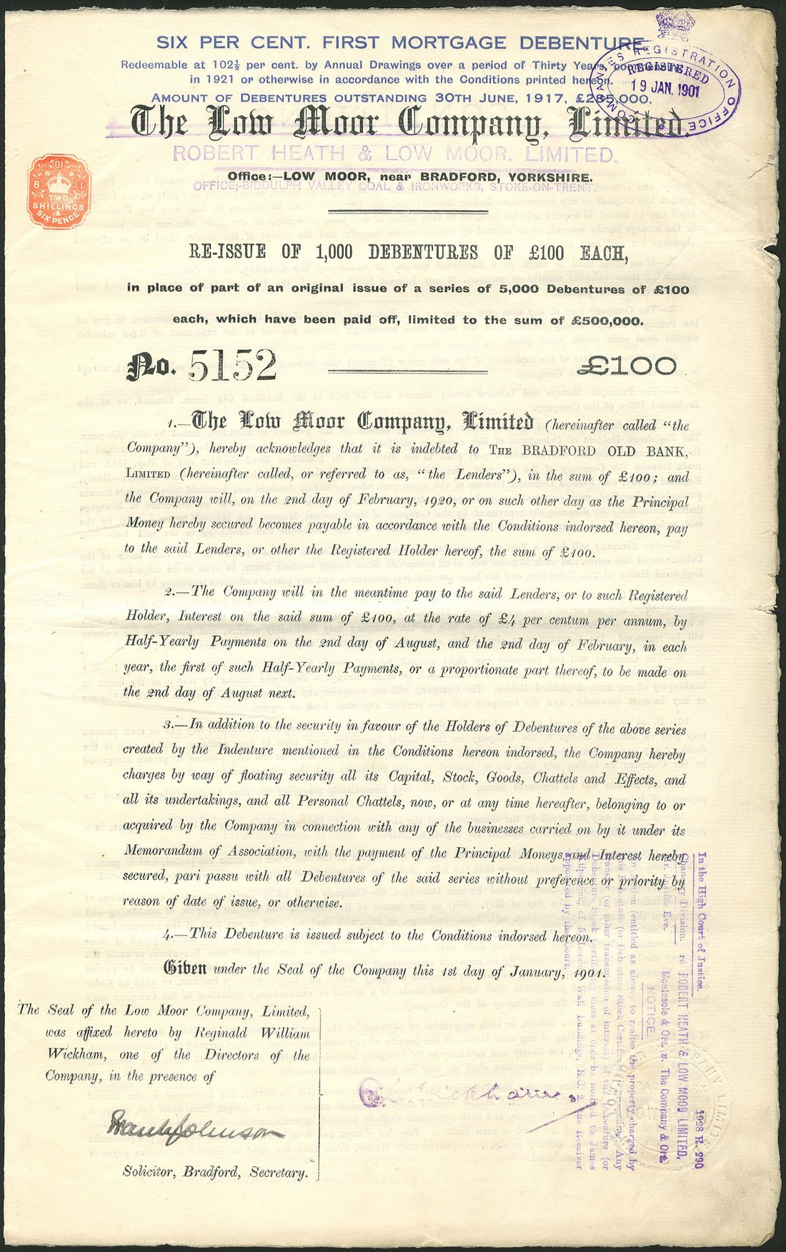 Low Moor Company Ltd., a group of 20 6% First Mortgage debentures each for £100, 1888 (11), re-issue, 1901 (1 only) and re-issue 1914 (8), large format pieces, black printing, 4 pages, together with Robert Heath and Low Moor Ltd., one certificate for £1 shares, 19[21], ornate border, green, and a group of debentures for £20 (1), £50 (3) and £100 (7), all 19[20], ornate border, green, blue and brown respectively, printed by Waterlow & Sons, 4 pages, very fine, some better. (31)