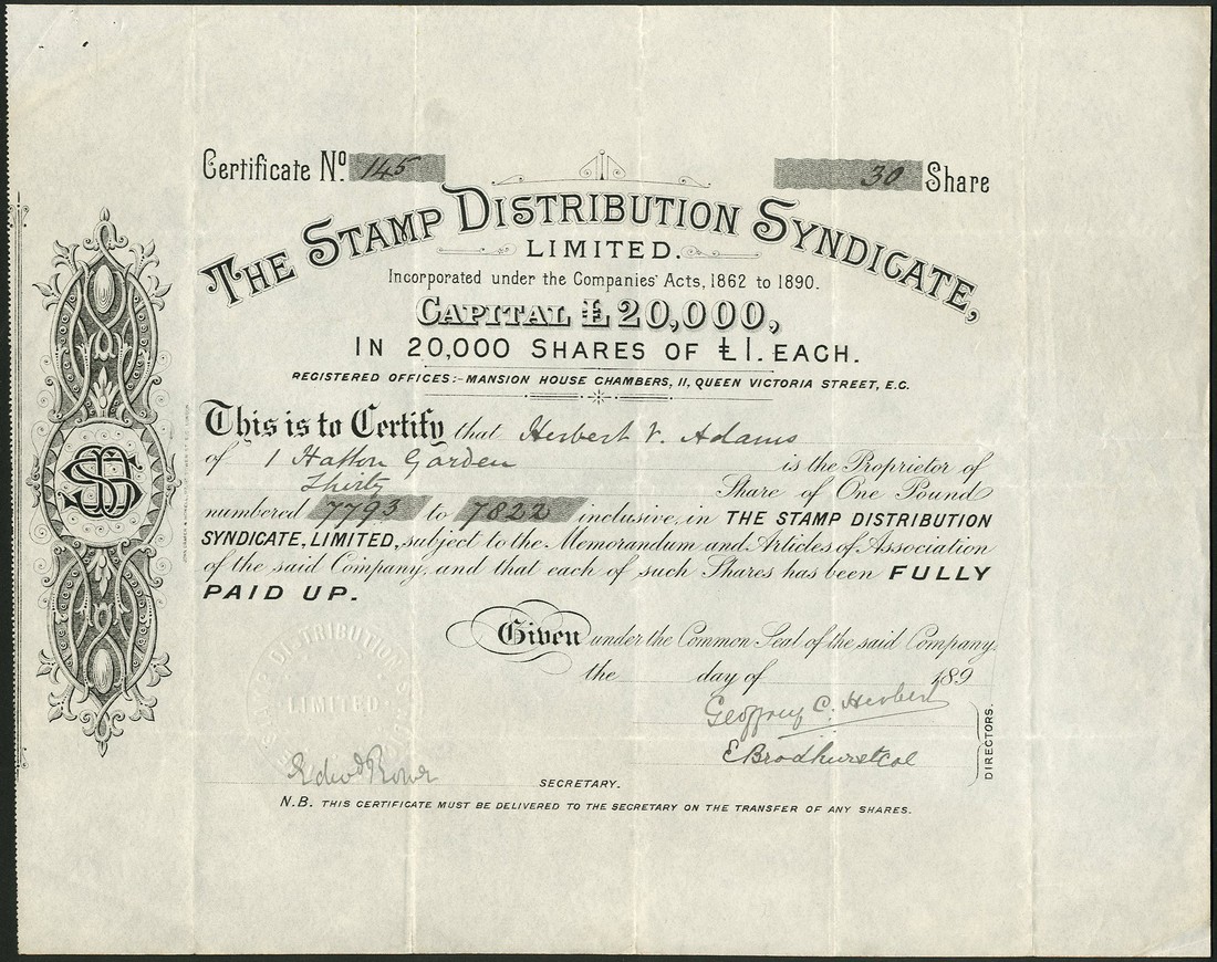 Stamp Distribution Syndicate Ltd., £1 shares, fully paid up, 189[-], no.145, decorative title and scrollwork at left, black, pin holes at top left, otherwise good very fine.