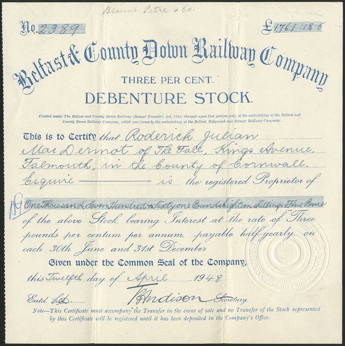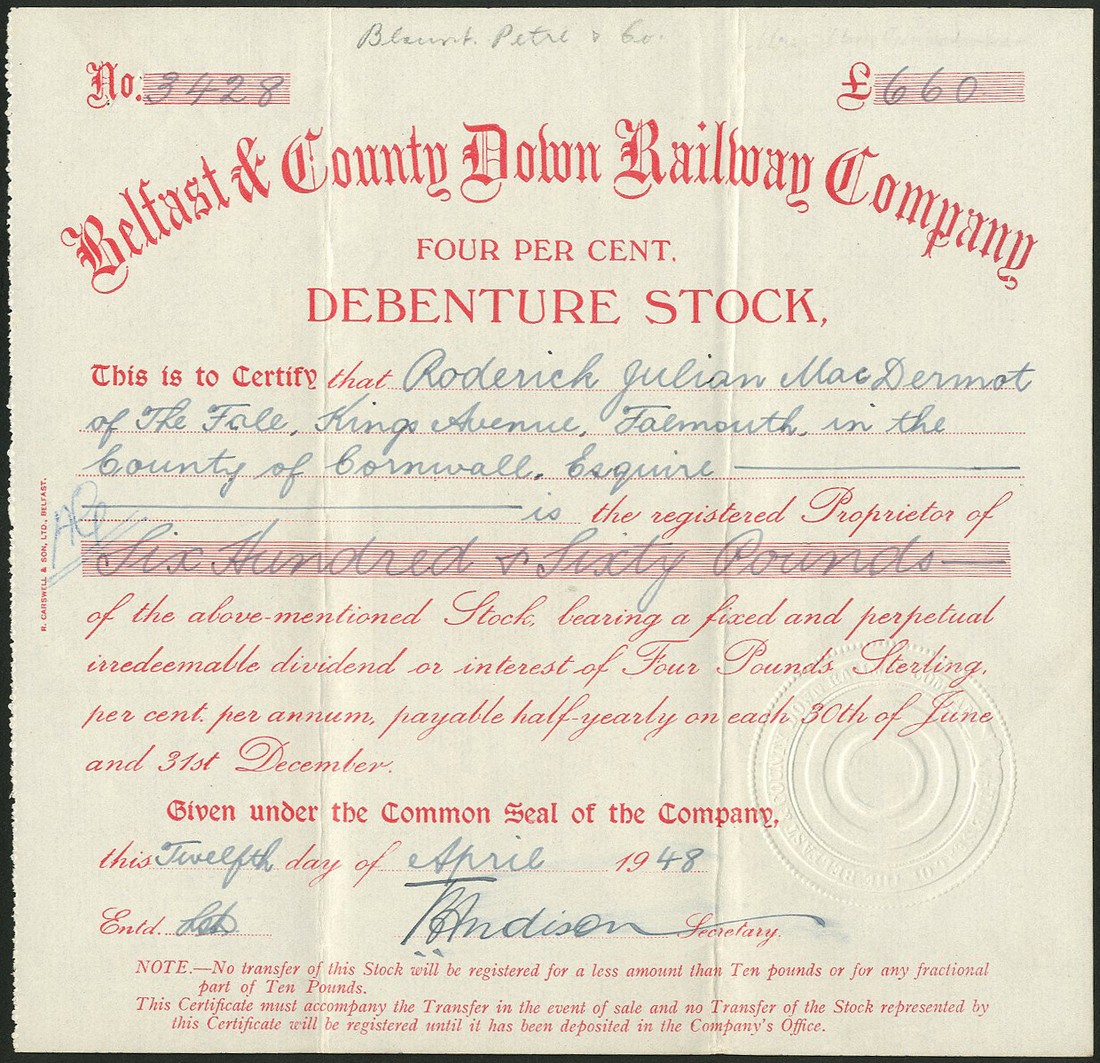 Belfast & County Down Railway Co., 3% debenture stock, 19[26], no.1818, and 19[48], no.2389, both blue, and 4% debenture stock, 19[48], no.3428, red, all have embossed seal, good very fine. (3)