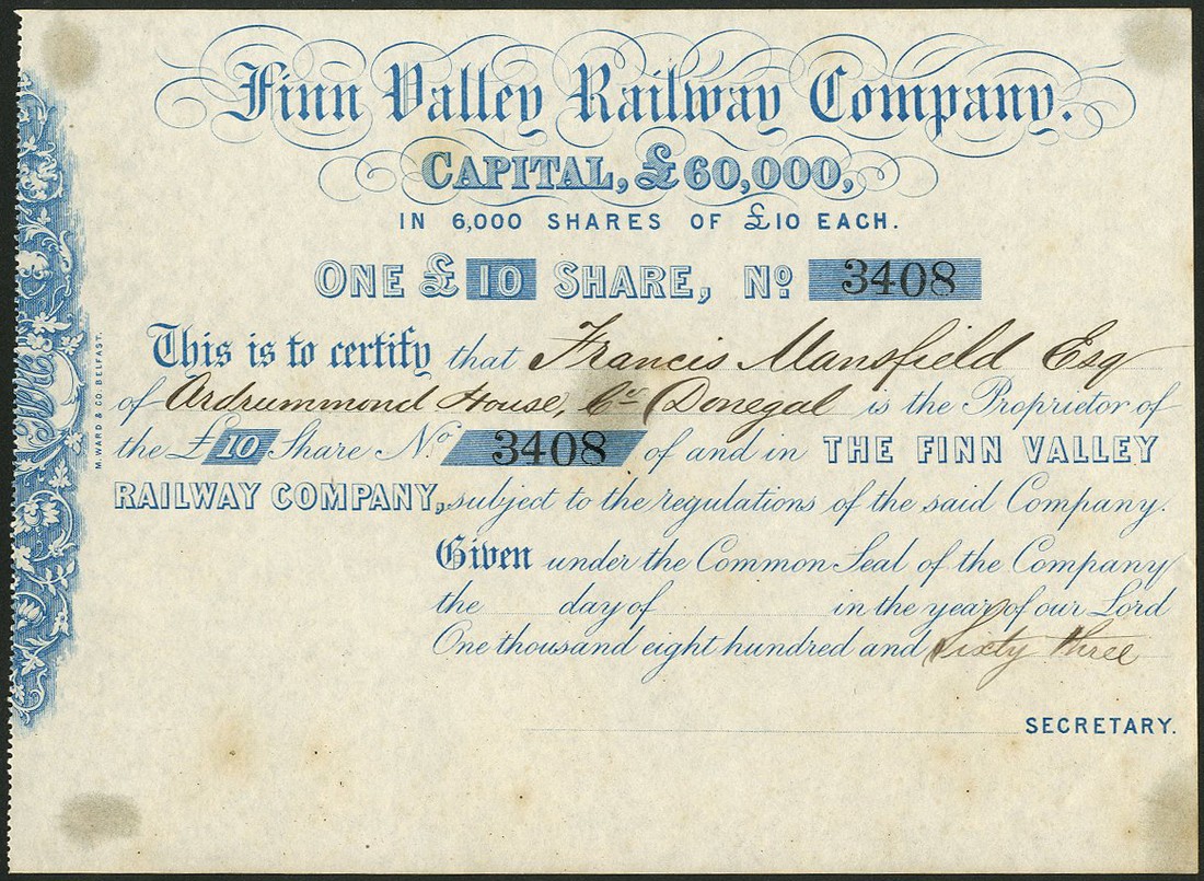 Finn Valley Railway Co., one £10 share, 18[63], no.3408, decorative title and scrollwork at left, blue, not signed by Secretary, some light foxing, very fine.