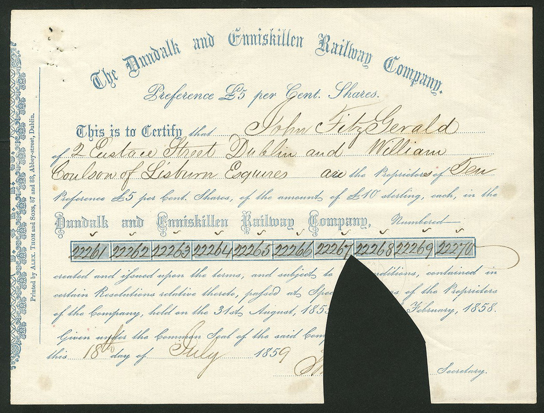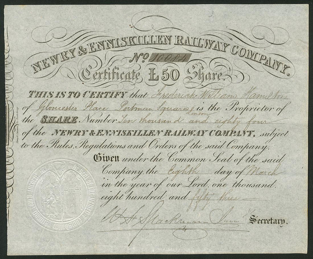 Newry & Enniskillen Railway Co., £50 share, 18[53], no.10084, black, embossed seal, together with; Enniskillen, Bundoran & Sligo Railway Co., £10 shares, 186[2], black with brown underprint, title amended from Enniskillen and Bundoran Railway, this folded separated and repaired; Dundalk and Enniskillen Railway Co., 5% preference shares for £10, 1858, blue, seal removed; and transfer certificate from the Enniskillen, Bundoran and Sligo Railway Co., very fine. (4)