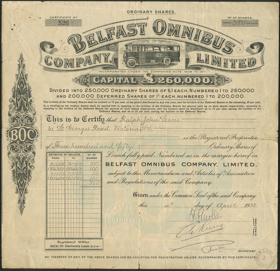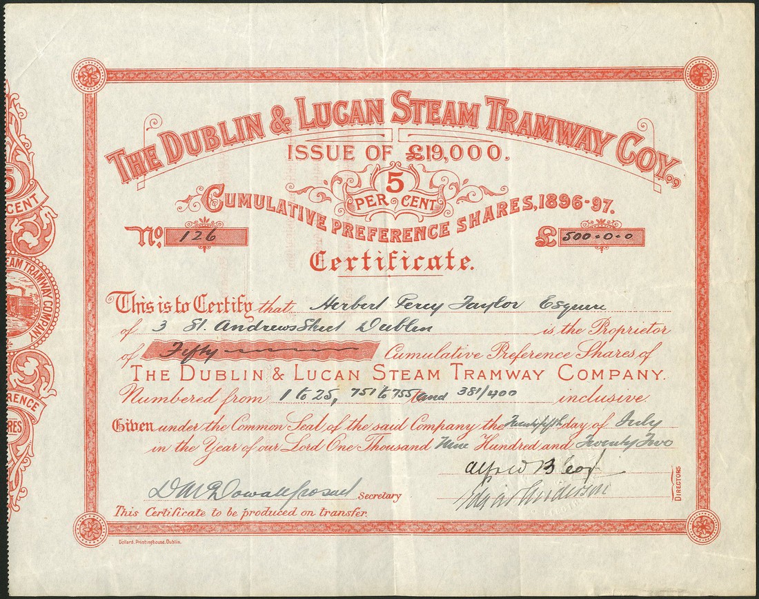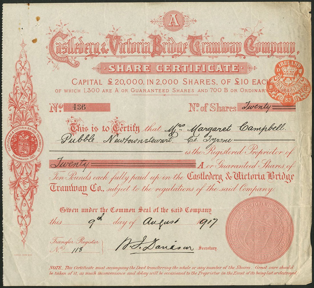 Castlederg & Victoria Bridge Tramway Company, certificate for £10 shares, 18[917], decorative title and scrollwork at left, red, and four separate hand written notes concerning the line, some from William Irwin as Secretary and Manager, together with Dublin & Lucan Steam Tramway Co., cumulative preference shares, 1[922], red, and Belfast Omnibus Co. Ltd., £1 ordinary shares, 19[32], nice vignette of motor bus, black, pale blue underprint, fine to very fine. (3)