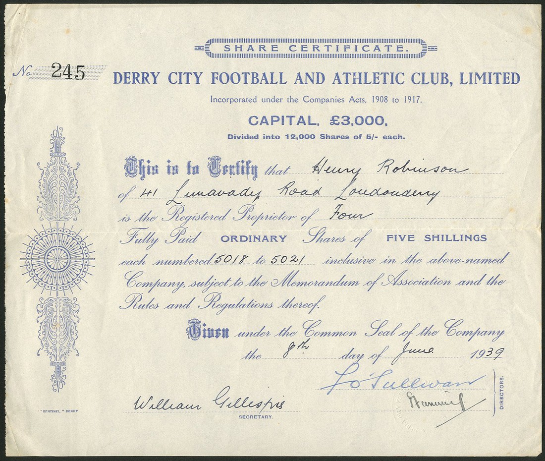 Derry City Football and Athletic Club Ltd., ordinary shares of 5 shillings each, 19[39], no.245, scrollwork at left, blue printing, very fine.