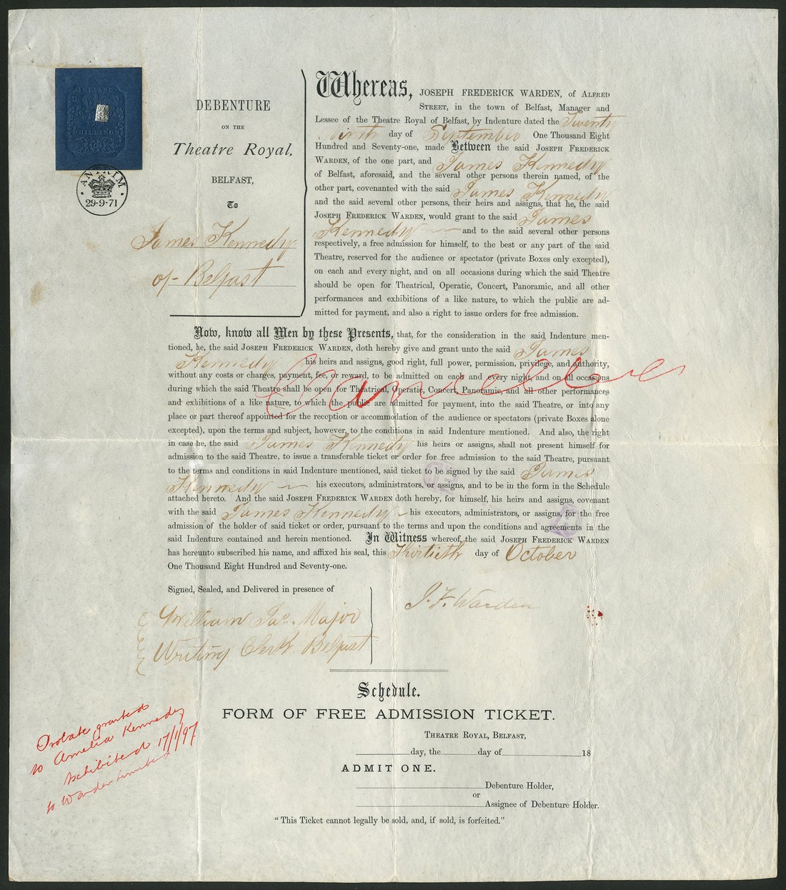 Theatre Royal, Belfast, a debenture, 1871, certifying that James Kennedy of Belfast may have free admission to the theatre at any time, signed by Joseph Frederick Warden as Manager of the theatre, black printing on vellum, cancelled, notes of probate at bottom in red, good very fine.
