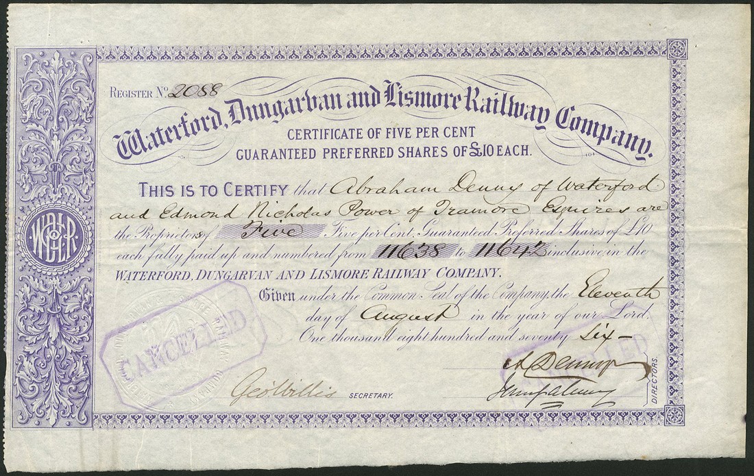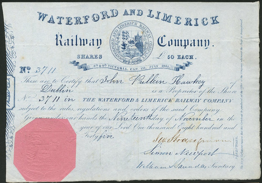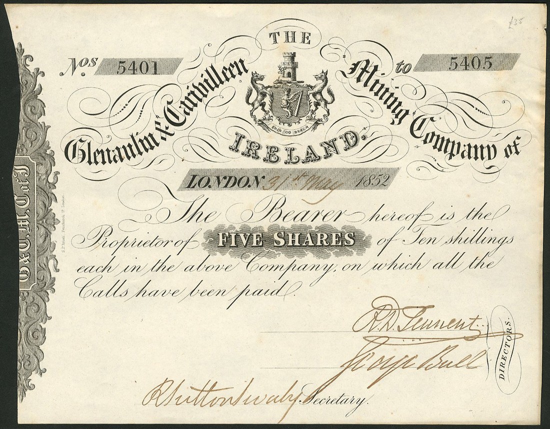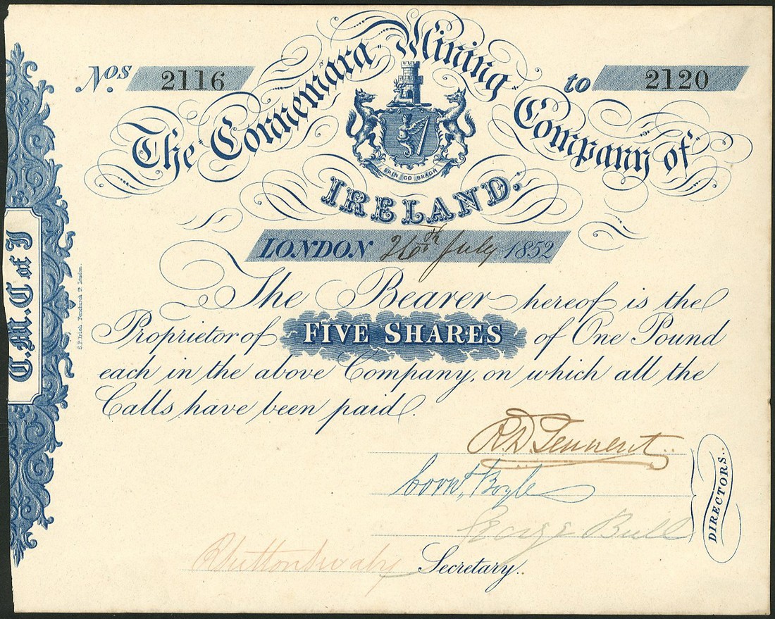 A small group of 10 Irish certificates, comprising; Waterford and Limerick Railway Co., £50 shares, 184[5], company seal at top, blue; Connemara Mining Co. of Ireland, 5 shares of £1, London 1852, blue (2); Glenaulin & Carivilleen Mining Co. of Ireland, 5 shares of 10 shillings, London 1852, black (2); Electric Telegraph Co. of Ireland, 5 shares of £1, 185[2], black; Holyford Copper Mining Co. Ltd., 5 shares of £1, 186[4], black, and Waterford, Dungarvan and Lismore Railway Co., 5% guaranteed preferred shares of £10 each, 187[6] (2) and 18[86] (this one damaged where mounted previously), a couple with very light marking, otherwise good very fine, last three very fine and fine (as noted). (10)