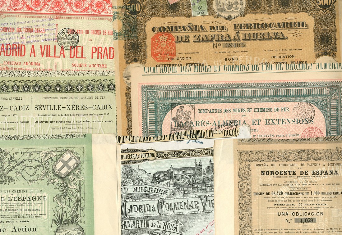 A group of European Railway companies, mainly Spanish, comprising Cia. del Ferro-Carril de Palencia á Ponferrada Noroeste de España, 1900 reales (500 francs) bond, 1862, lovely scrollwork border and steam engine at bottom, black on buff; Cia. de los Caminos de Hierro Sur de España, 500 peseta share, 1910, ornate border with steam train at bottom, port and factory scenes and coats of arms, green and black; Cia. de los Ferrocarriles Economicos de Villena á Alcoy y Yecla, 475 peseta bond, 1902, winged female to left, steam train bottom right, blue and pink; S.A. Tranvia á Vapor de Madrid á Colmenar Viejo y Ramal á Chamartin de la Rosa, 500 peseta mortgage bond, 1898; Cia. del Ferro Carril de Madrid a Villa del Prado, 300 peseta bond; Compagnie des Mines et Chemins de Fer Bacares-Almeria et Extensions, 500 franc share; Cia. del Ferrocarril de Zafra á Huelva, 500 peseta bond; Cia. Anonima de los Ferro-Carriles Sevilla-Jerez-Cadiz, 1900 reale share, and Cia. de los Ferrocarriles Oeste de España, 500 peseta share, all good very fine, the first few almost extremely fine. (9)