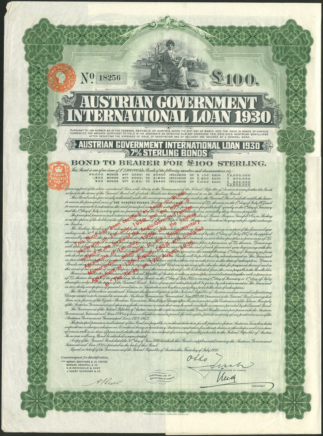 Austrian Government International Loan, 1930, 7% Sterling Bond for £100, no.18256, allegorical female at top, ornate border, green and black, printed by Waterlow & Sons Ltd., with coupons, overprinted in red on face noting British ownership in 1938, good very fine.